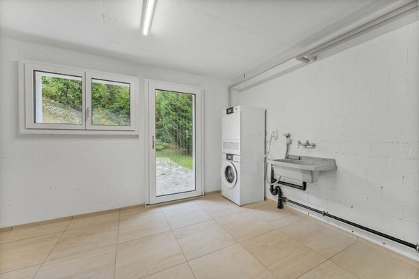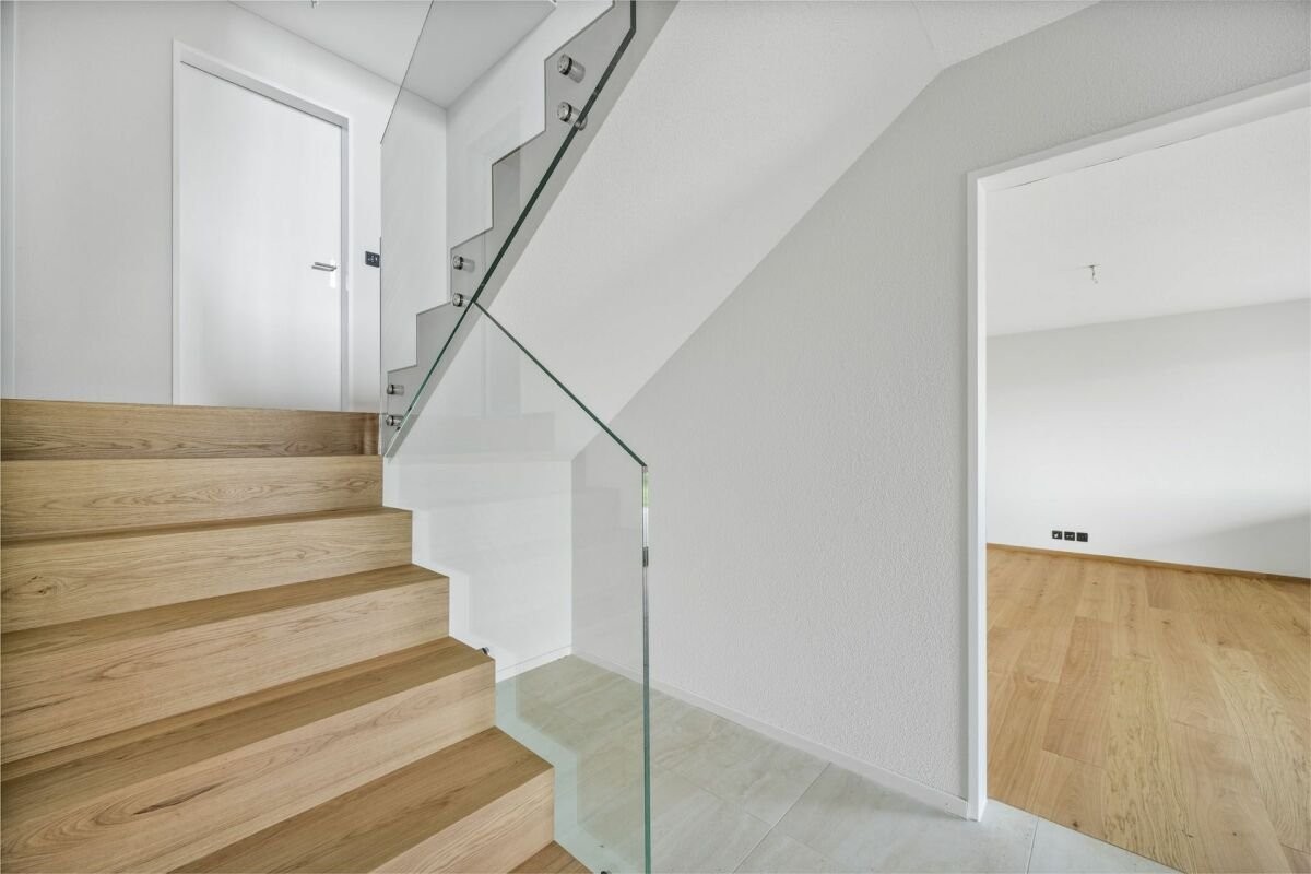Im Erdgeschoss lädt der offene Wohn- und Essbereich mit grossen Fensterfronten zum Verweilen ein. Hier verschmelzen Innen- und Aussenraum - ideal für gemütliche Familienabende oder gesellige Dinner mit Freunden.