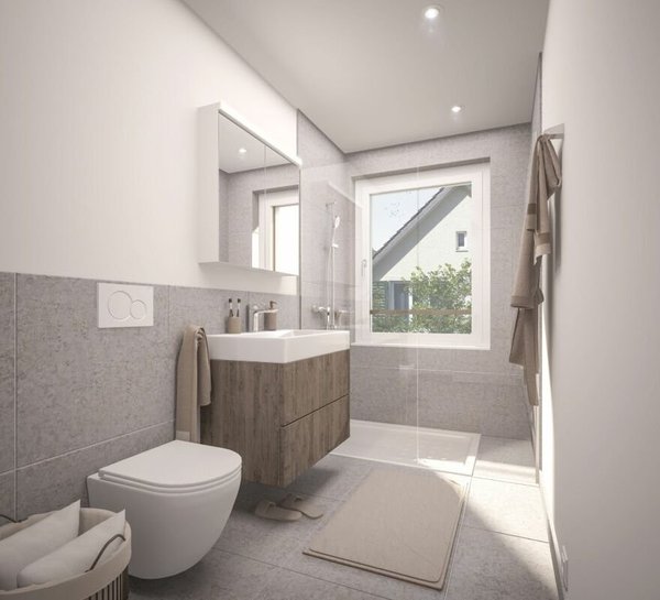 Jedes Haus mit zwei vollwertigen Nasszellen ( Dusche/WC + Dusche/WC) mit Feinsteinzeugplatten in Natursteinoptik.