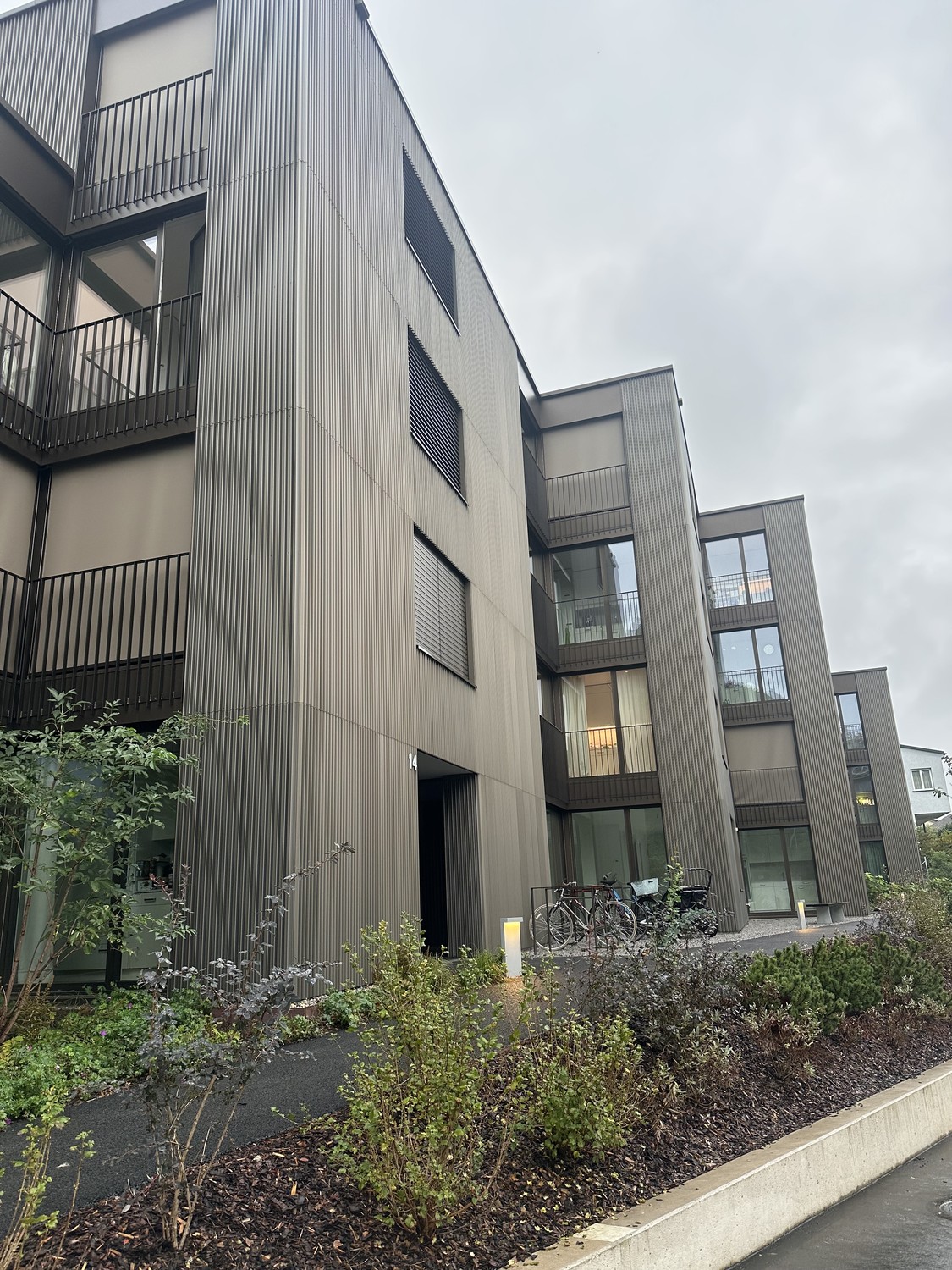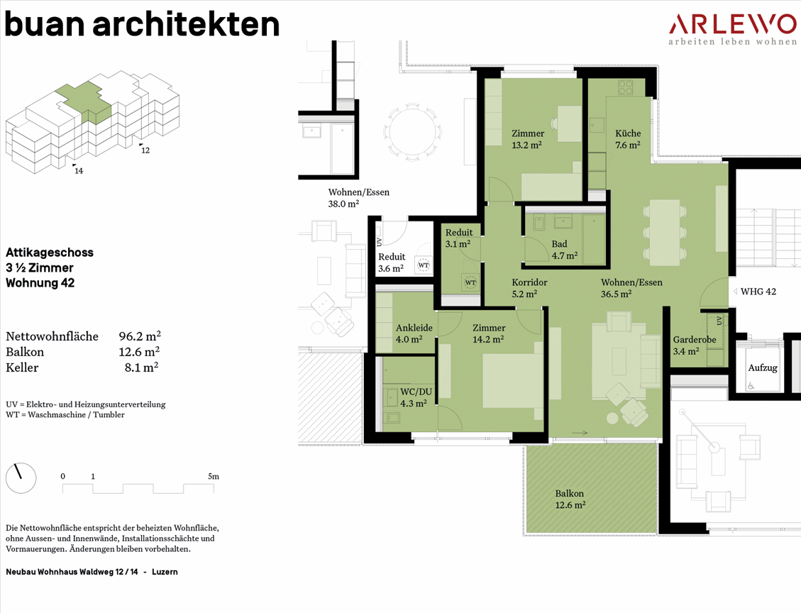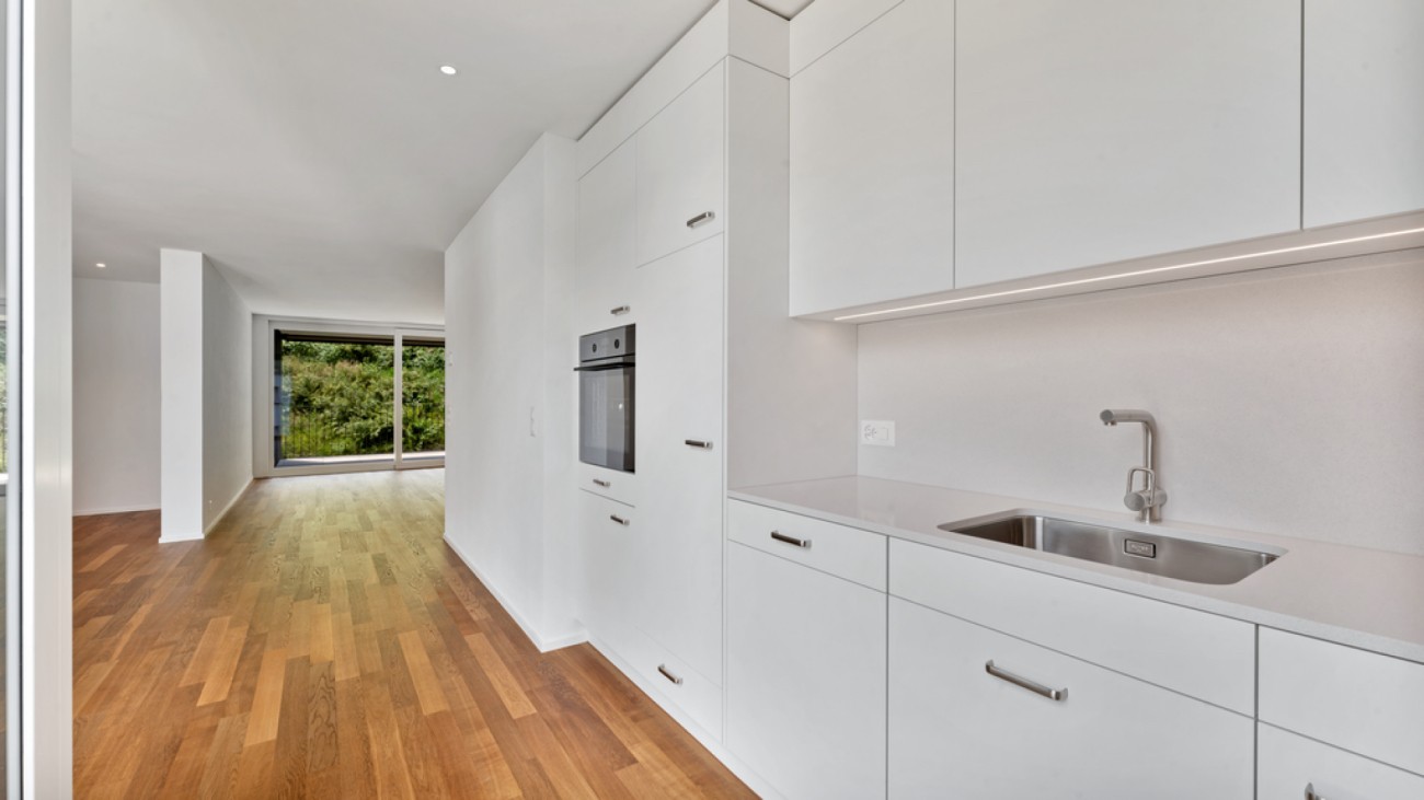 Wohnung im 3. Stock eines Neubaus 2024 am ruhigen Waldweg. 96.2 m2 Wohnflaeche, 12.6 m2 Balkon, 8.1 m2 Keller. Highlights