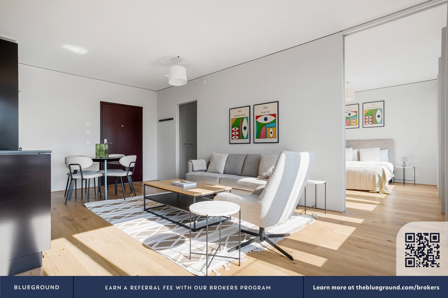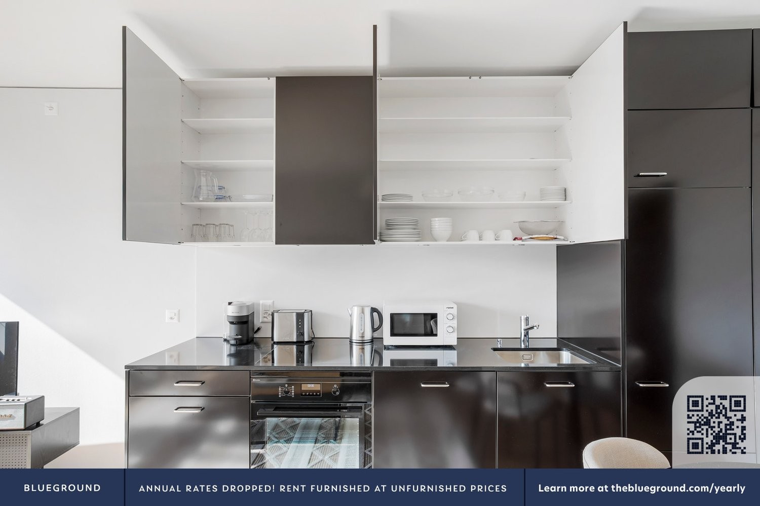 Wie bei jedem Blueground Wohnung finden Sie einen durchdacht gestalteten Raum mit schönen Möbeln. und eine voll ausgestattete Küche in diesem Ein-Schlafzimmern Immobilie. Und dank unserer hochwertigen Matratzen können Sie sich entspannen, weil Sie sich immer wie zu Hause fühlen werden. Wenn Sie Lust auf etwas Spaß haben, können Sie die Basel -Atmosphäre genießen oder sich die Unterhaltung mit dem kabellosen Premium-Lautsprecher oder dem Smart-TV direkt nach Hause holen.