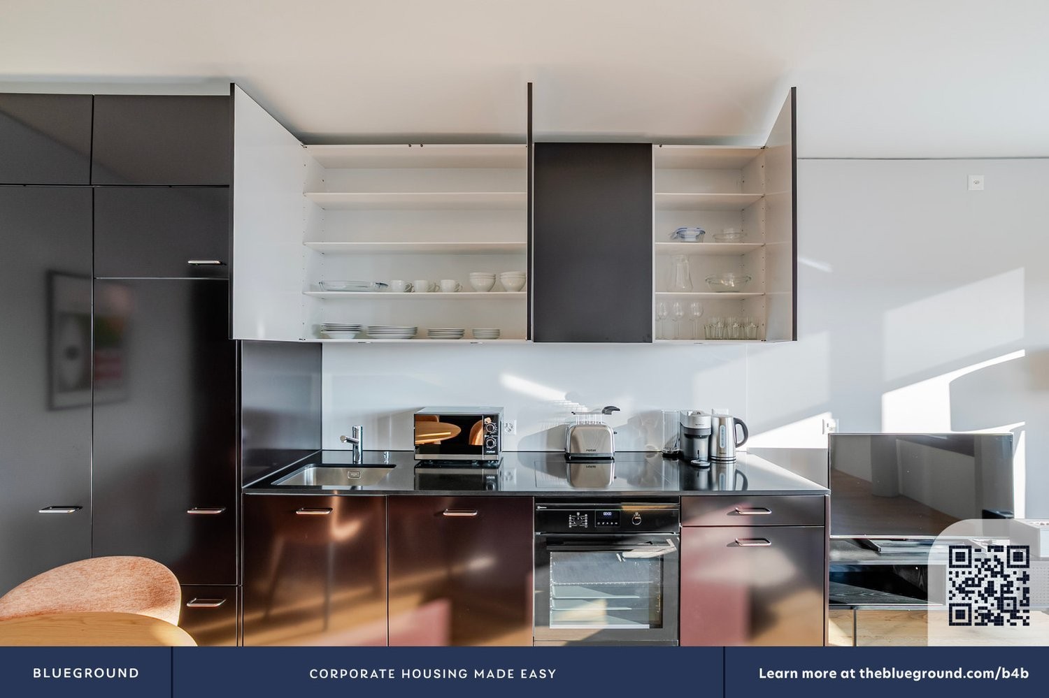 Während Ihres Aufenthalts haben Sie über die Blueground-App Zugriff auf unser Customer Experience-Team. Sie können zusätzliche Reinigungsarbeiten planen, Wartungsanfragen einreichen und unsere Nachbarschaftempfehlungen mit nur wenigen Fingertipps anzeigen.