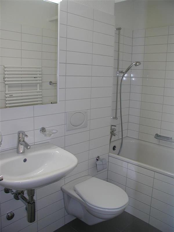 - Badezimmer mit WC, Lavabo, Spiegelschrank und Badewanne