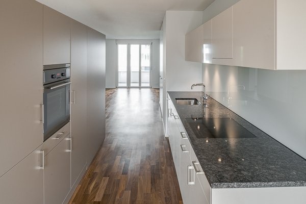 - Küche mit Hochglanzfronten, Glaskeramikherd, Geschirrspüler und Granitabdeckung