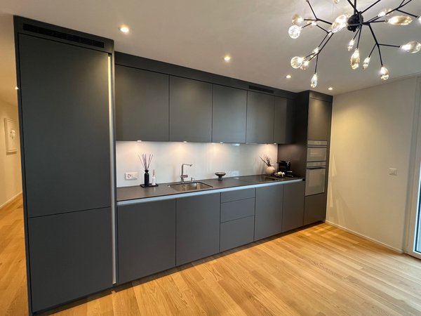 Offenes Küchenkonzept: Moderne Küche mit dunkelgrauen Schränken, hochwertigen Geräten und elegantem Design. Der Backofen und der Steamer sind von V-Zug.