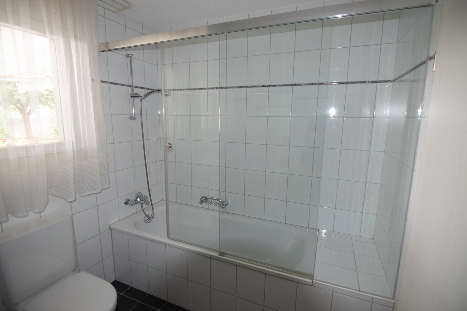 · Badezimmer: Geräumiges Bad mit Badewanne (inkl. Glastür), Waschbecken, Toilette und Fenster.