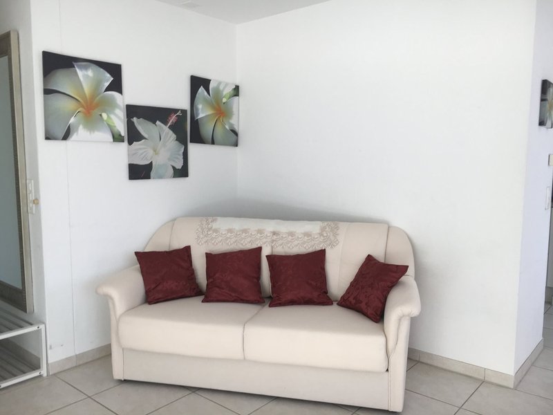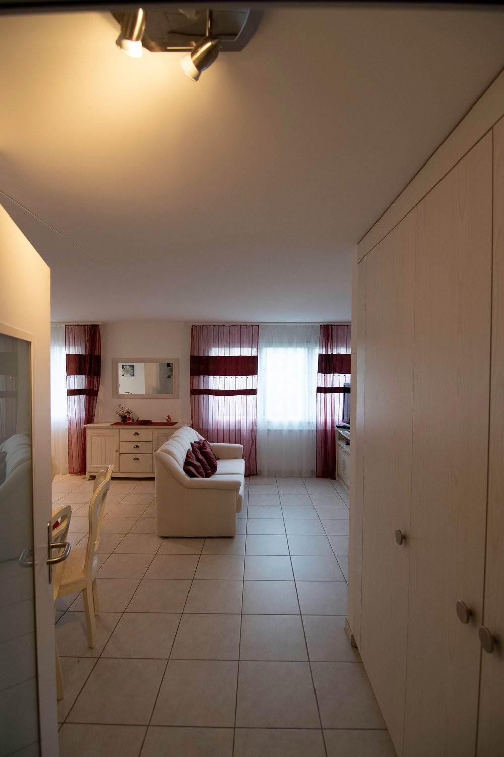 · Wohnzimmer: Runder Esstisch mit 4 Stühlen, Schlafsofa, zusätzlicher Kleiderschrank, grosse und kleine Kommoden, TV-Möbel, Flachbildfernseher, Spiegel, Wanddekorationen.