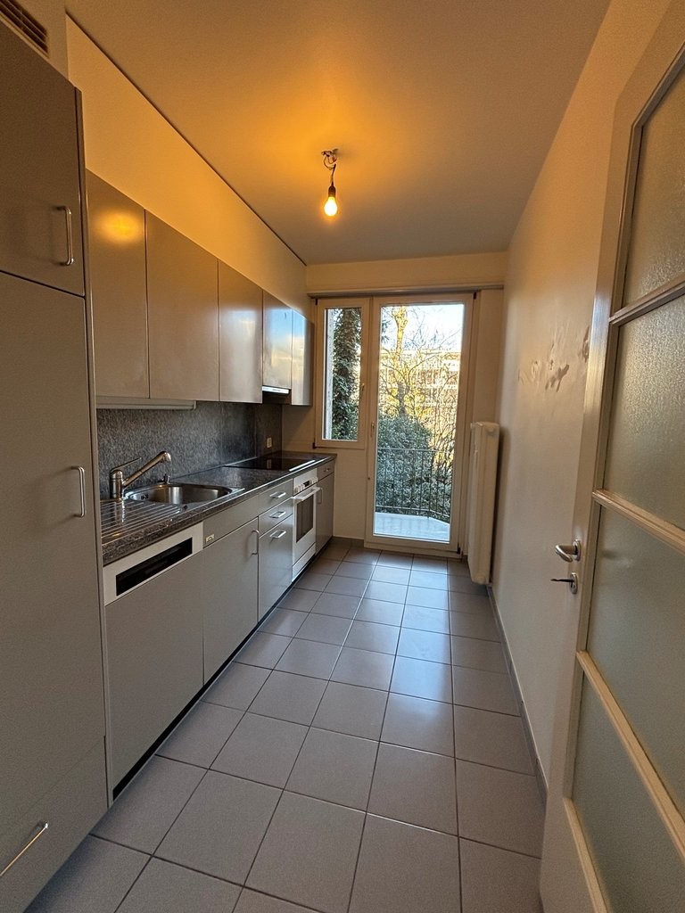 Die Küche ist in grau gehalten und mit einem grauen Plattenboden ausgestattet. Die Küche verfügt über einen Kühl- und Gefrierschrank, einen Glaskeramikherd sowie einem Backofen. Zudem gelangen Sie von der Küche auf den hofseitigen Balkon .