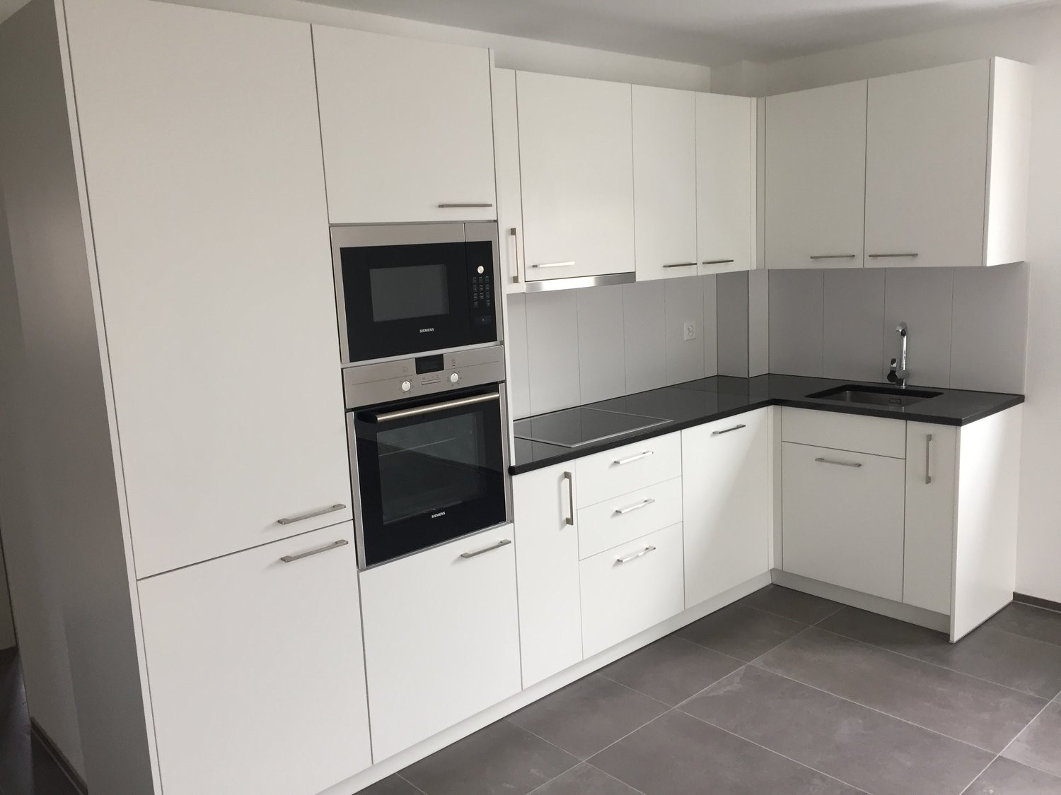 - moderner Küchenausbau mit hellen Keramikfliesen
