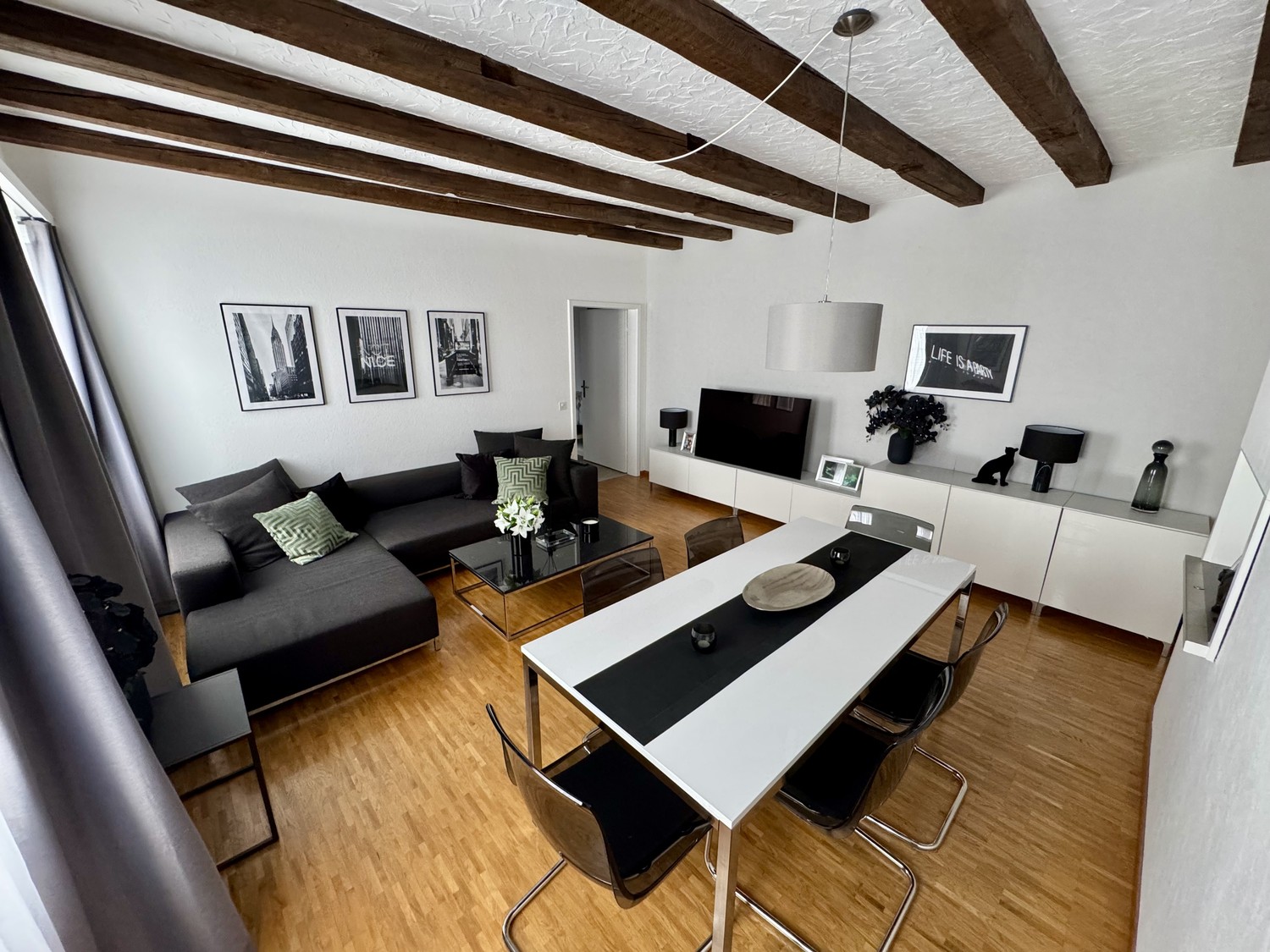 Wohnzimmer mit sichtbaren Holzbalken und Platz für Wohnen & Essen