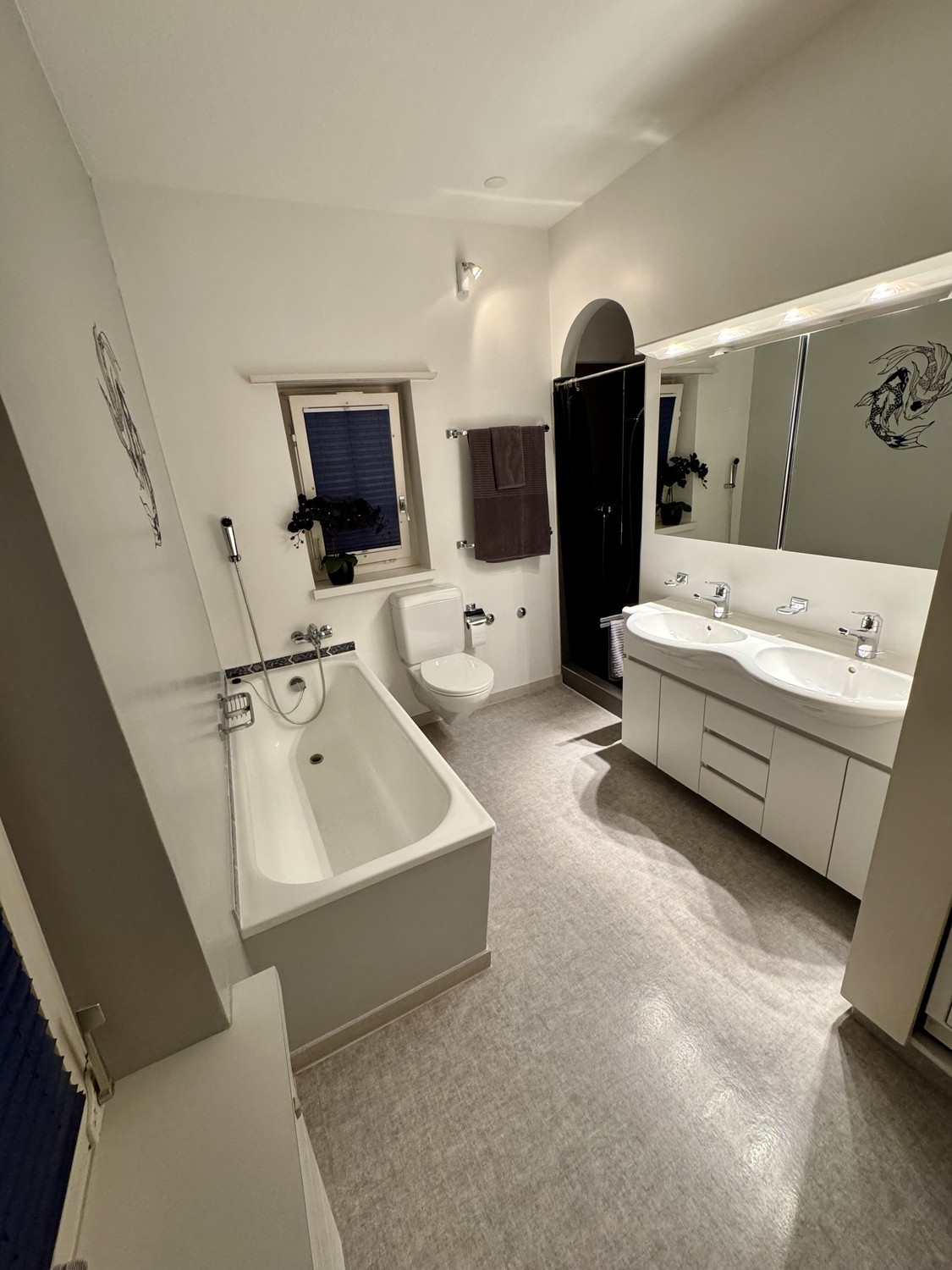 Badezimmer mit Dusche, Badewanne, Doppelwaschbecken & Spiegelschrank