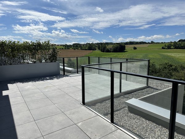 Grosszügiger Balkon: Geflieste Terrasse mit Glasbrüstung und herrlichem Blick über die Landschaft