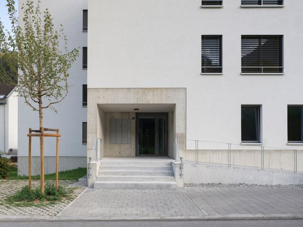 Moderne Farbgestaltung der Fassade, Sockel aus Sichtbeton