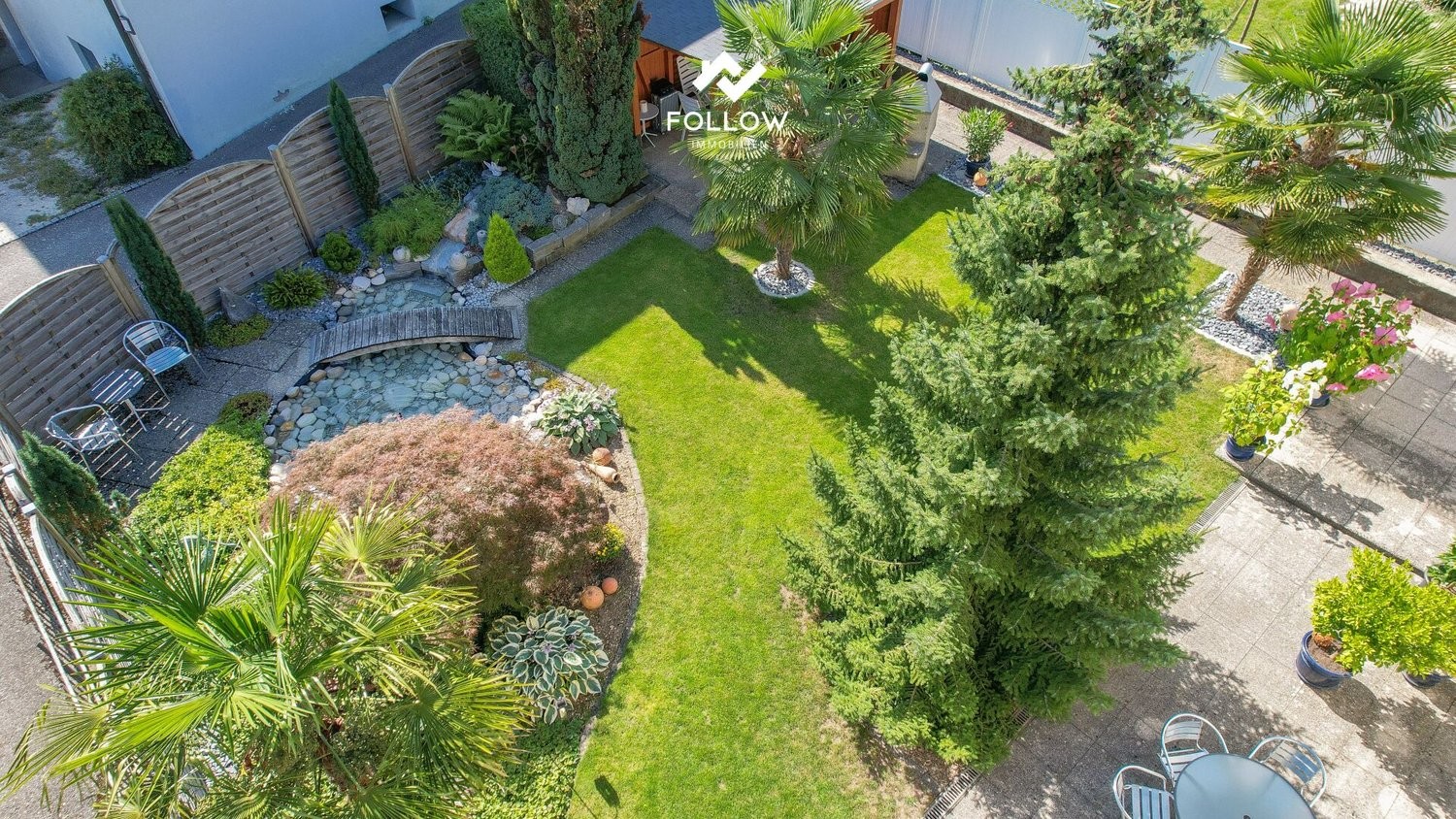 Ein absolutes Highlight ist der traumhafte Garten, der mit seiner liebevollen Gestaltung sofort ins Auge fällt. Grosse Palmen, üppige Blumenbeete und ein malerischer Teich schaffen eine einladende Oase, die zum Verweilen einlädt. Hier kann man die Natur in vollen Zügen geniessen - sei es auf dem überdachten Sitzplatz oder in einem offenen Bereich, der perfekt für gemütliche Sommerabende ist.