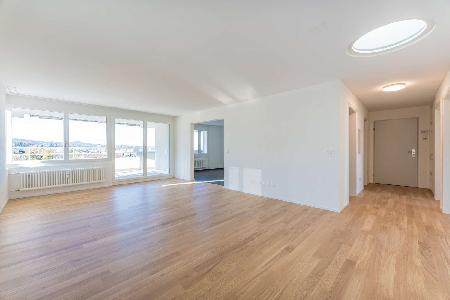 - Offener Wohn- und Essbereich mit edlem Parkettboden und direktem Zugang zum Balkon