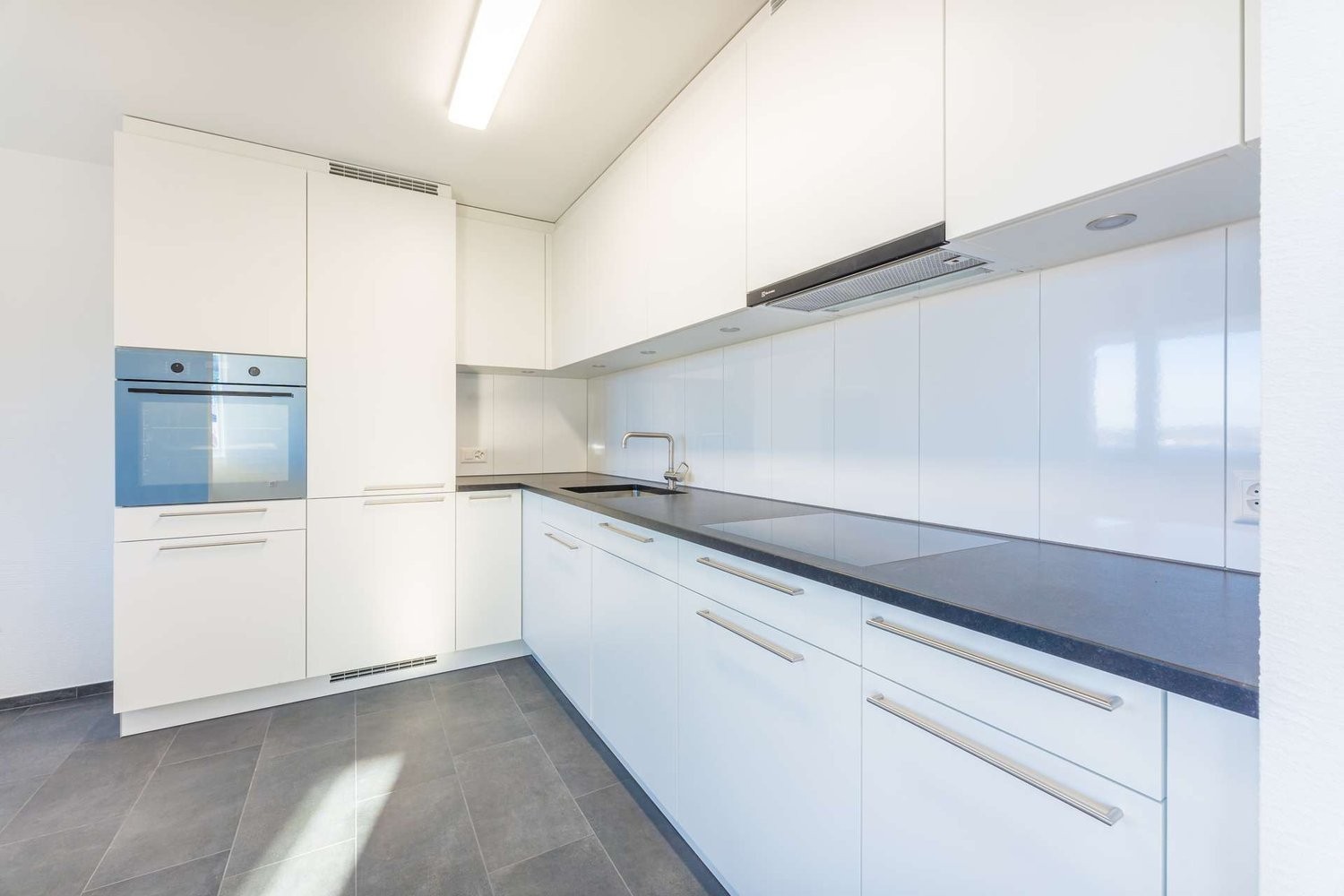 - Helle Küche mit Plattenboden, Glaskeramikherd und Geschirrspüler