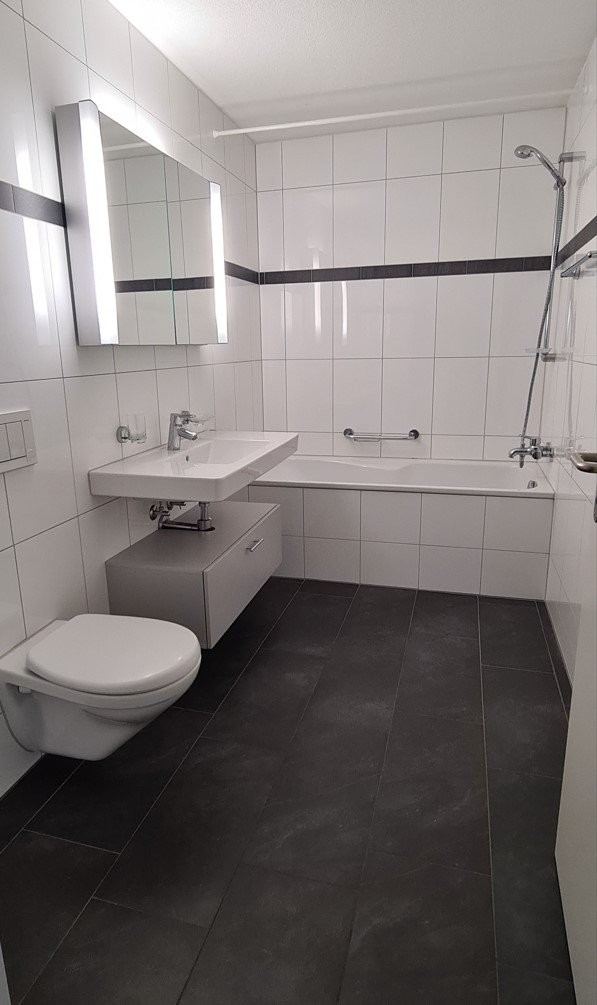 - Nasszelle mit Badewanne und dunklem Plattenboden