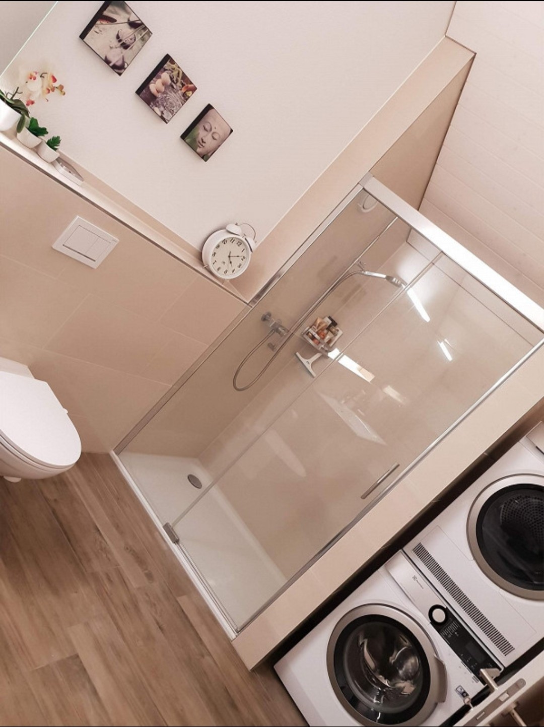 Grosses Badezimmer mit Dusche, Badewanne und eigenem Waschturm