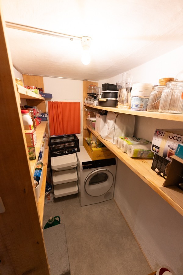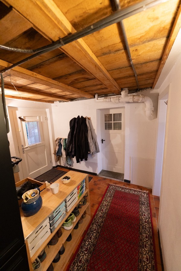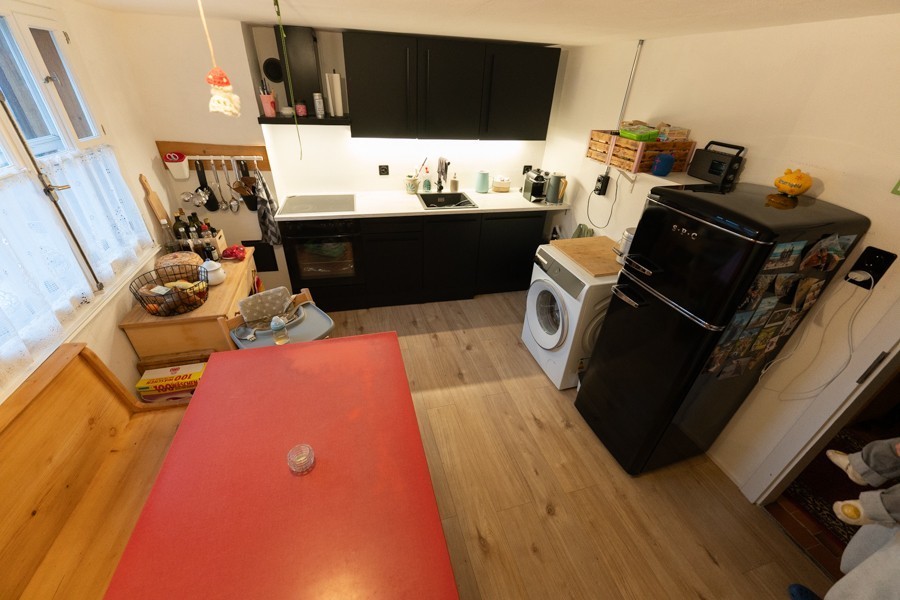 Die Küche wurde im Jahr 2024 umfassend renoviert und ist modern ausgestattet mit Kochherd, Backofen, Kühlschrank mit Gefrierfach sowie Geschirrspüler. Das gemütliche Wohnzimmer besticht durch sichtbare Strickwände und wird durch einen neuen Pelletofen beheizt, der gleichzeitig die Hauptheizquelle des Hauses darstellt. Das Badezimmer mit Badewanne ist nicht renoviert und ist aus den 1960er Jahren.