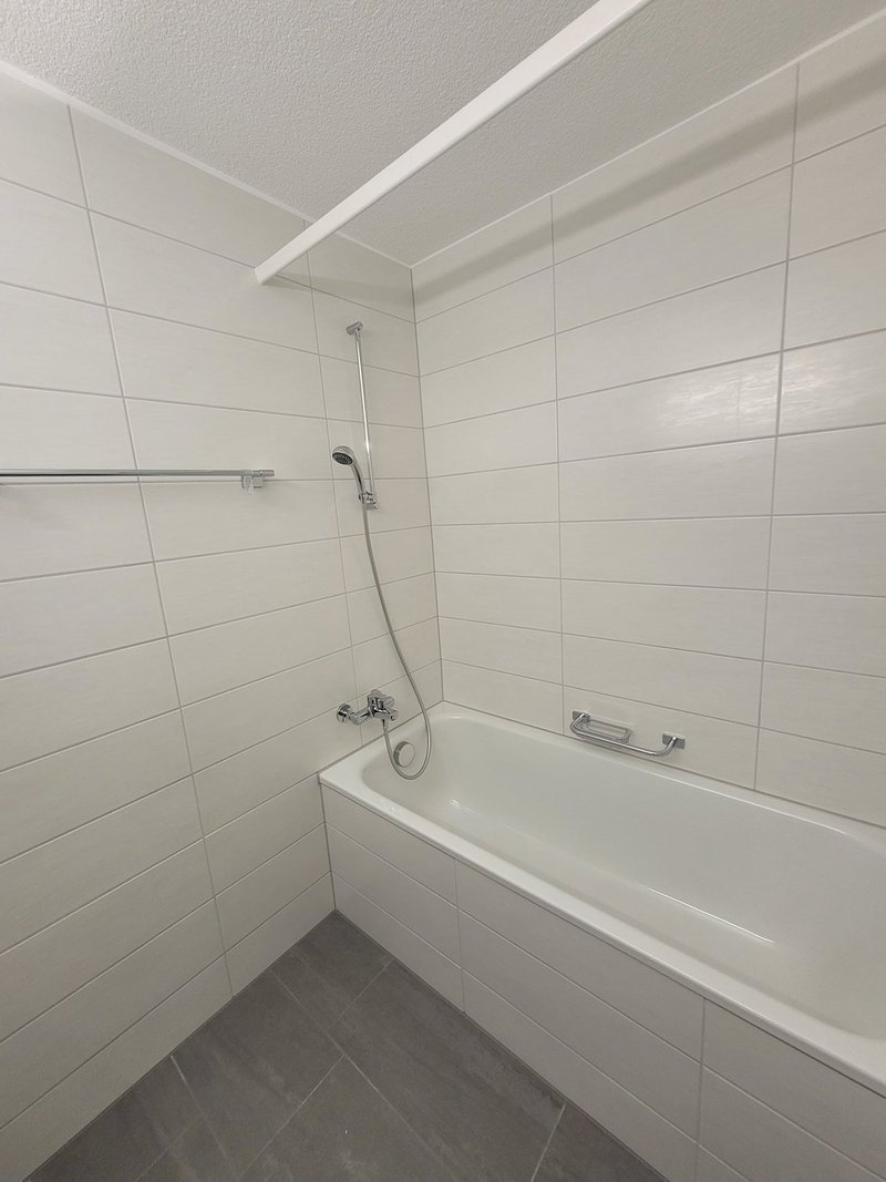 - Badezimmer mit Badewanne und dunklen Platten