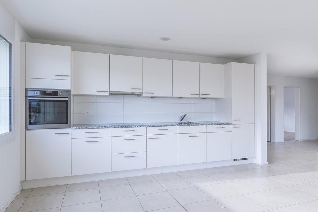 - Offene Küche mit hochliegendem Backofen, Geschirrspüler und Glaskeramikherd