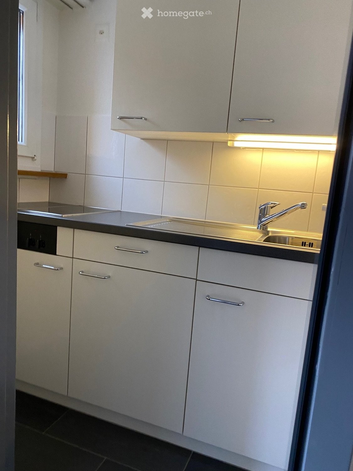Küche: 2.50 m2; Bodenbelag: Platten; Einrichtung: 2-Platten- Recheaud, Kühlschrank,