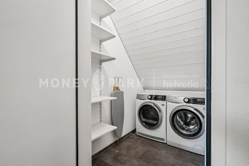 Im oberen Geschoss erwarten Sie zwei weitere Zimmer, eines davon mit grosszügigem Einbauschrank - beide mit herrlicher Aussicht. Die charmanten Dachschrägen verleihen den Räumen eine besondere Wohnatmosphäre und sind in der ausgewiesenen Nettowohnfläche bereits vollständig berücksichtigt. Ein modernes Badezimmer mit begehbarer Dusche sowie ein separater Waschraum mit Waschturm bieten zusätzlichen Komfort.