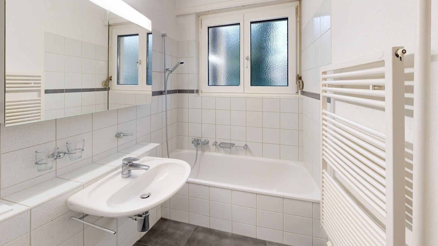 Die Wohnung verfügt über zwei Balkone, einen vom Badezimmer und einen vom Wohnzimmer aus begehbar, sowie eine kleine Loggia, die von der Küche zugänglich ist.