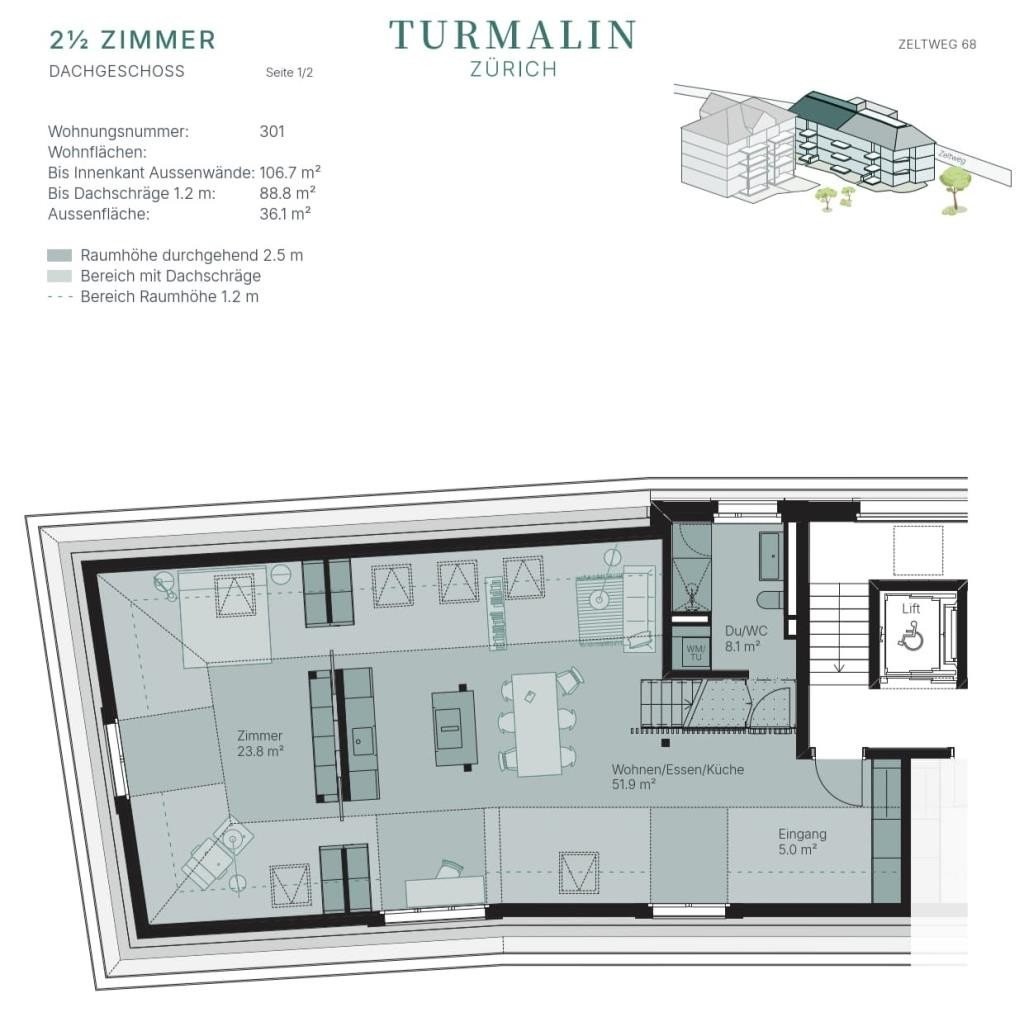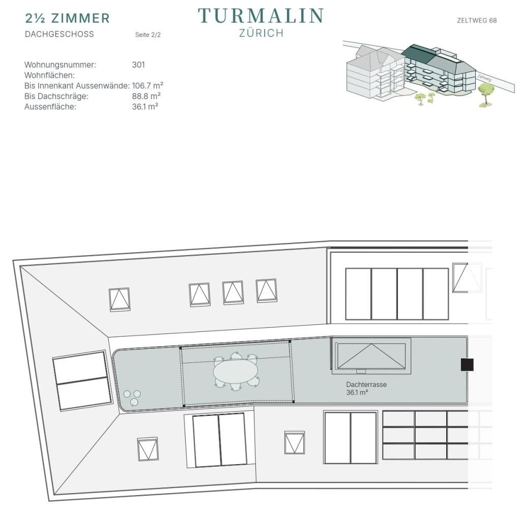 Entdecken Sie die letze freie attraktive 2.5-Zimmer-Dachgeschoss-Wohnung mit einer Wohnfläche bis zu ca. 89 m², einem durchdachten Grundriss sowie einem zeitlosen und hochwertigen Innenausbau im Projekt "Turmalin" an bester Lage im lebhaften Zürcher Quartier Hottingen.