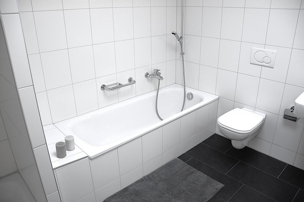 Badezimmer mit Badewanne, Dusche, Waschtisch, WC