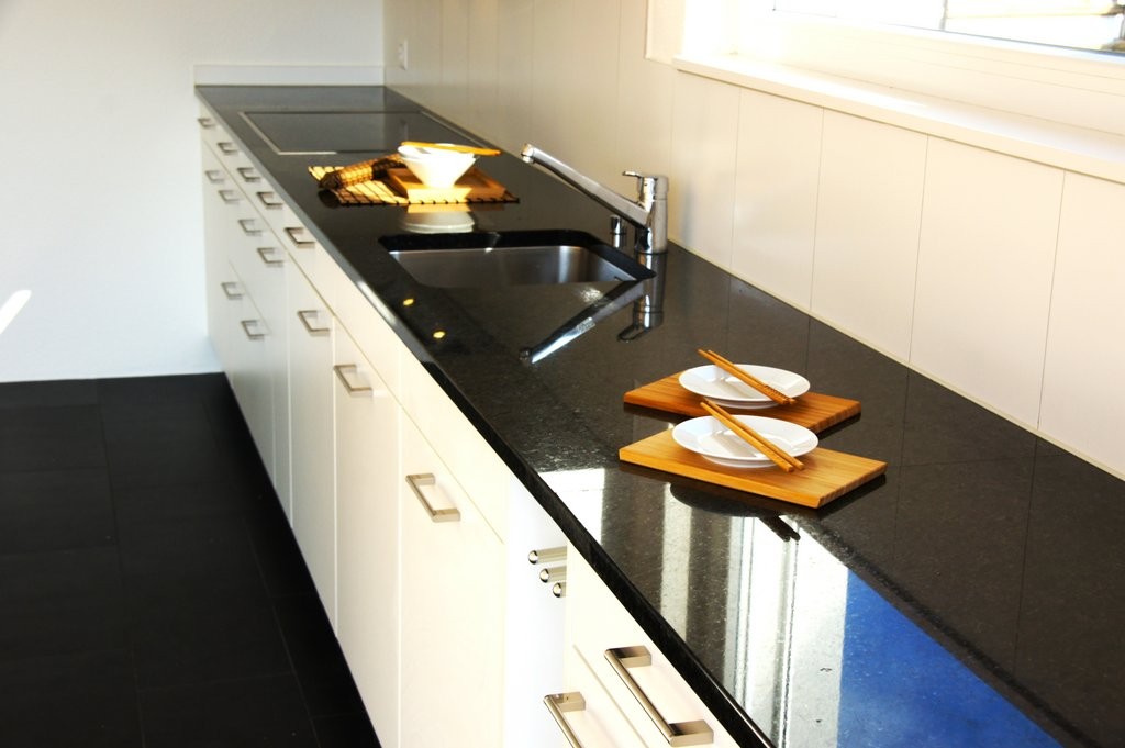 Moderne Einbauküche mit Glaskeramikkochfeld, Backofen, Geschirrspüler, Kühlschrankkombination mit abgetrenntem Gefrierfach, Granitabdeckung