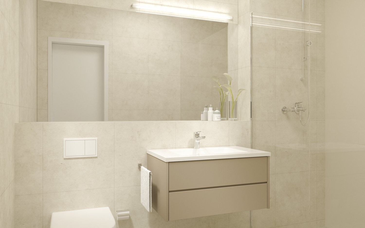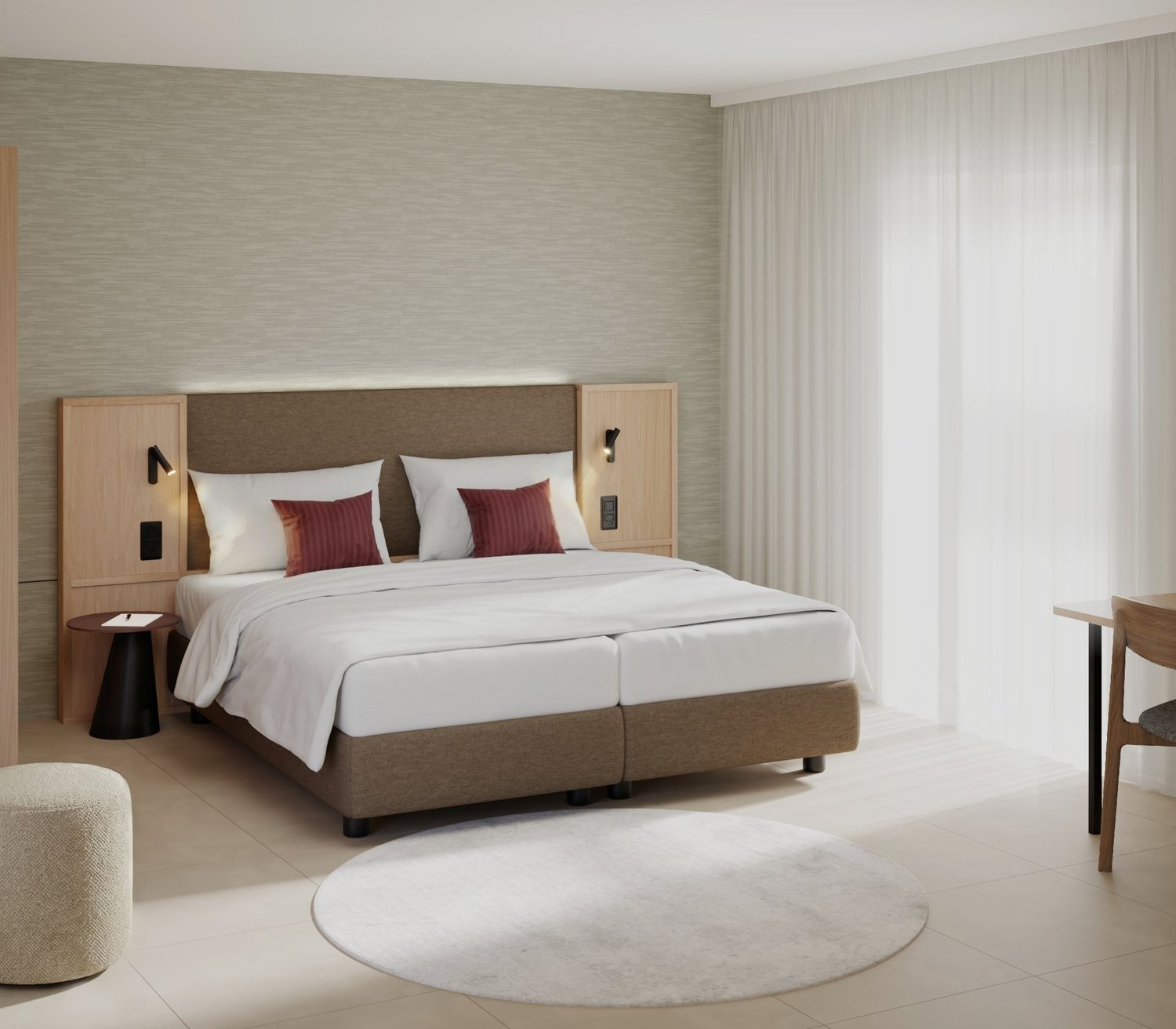 The apartments feature a double bed (160 × 200 cm) with two bedside tables, a workspace, a large wardrobe, and ample storage. The sofa bed invites you to relax and can be converted into a third bed. All apartments include a fully equipped modern kitchen and a bright bathroom with walk-in shower.