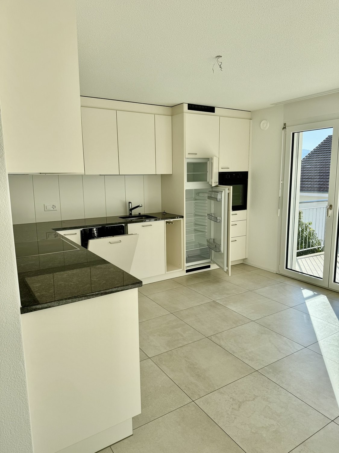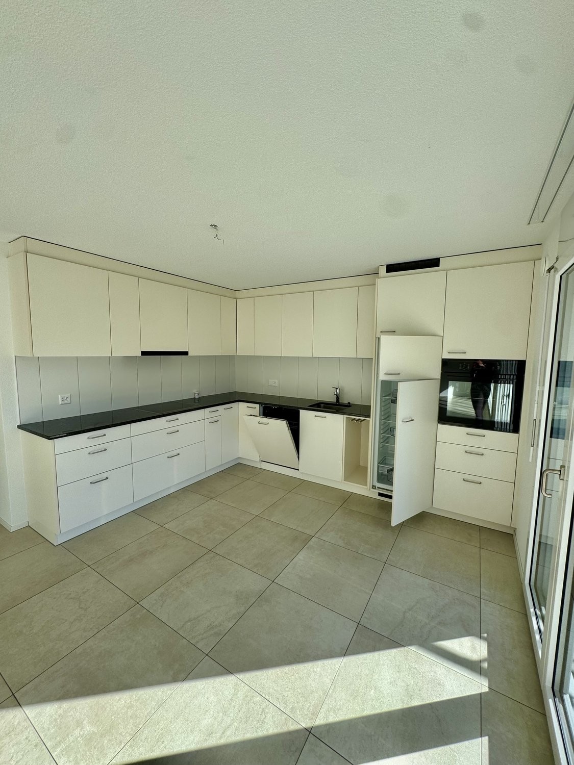 - Grosse Küche mit praktischen Einbauschränken, moderne Granitabdeckung, Glaskeramikkochfeld und pflegeleichtem Plattenboden