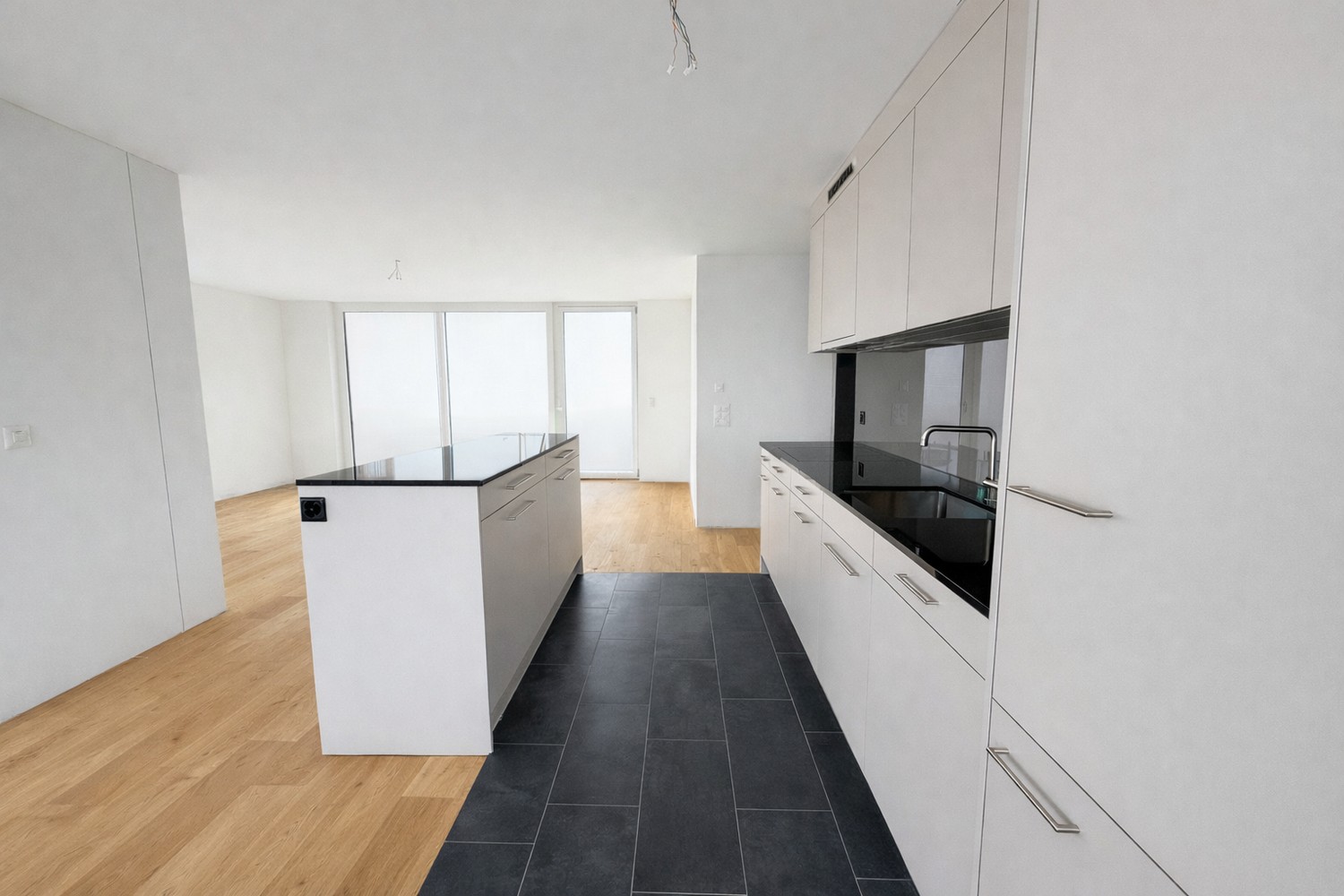 Die Küche mit Kochinsel überzeugt mit hellen, zeitlosen Fronten und einer dunklen Granit-Arbeitsplatte, die einen eleganten Kontrast schafft. Hochwertige Geräte der Marke V-Zug - darunter ein moderner Induktionskochherd, ein Backofen, ein grosszügiger Kühlschrank mit separatem Tiefkühler sowie ein Geschirrspüler - gewährleisten höchsten Komfort und Funktionalität.