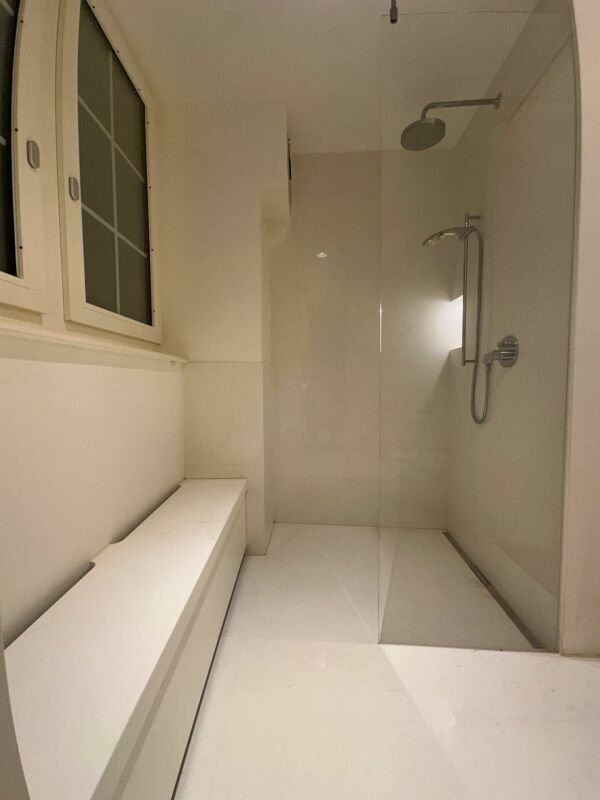 Bad mit begehbarer Dusche und Plattenboden