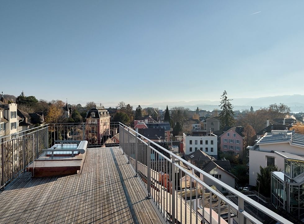 Durch den exklusiven Zugang zur Dachterrasse erhält man einen schönen Blick über einen Teil der Stadt Zürich, ein zweiter Balkon rundet das Angebot für entspannte Stunden im Freien ab.