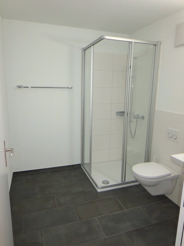 Badezimmer mit Duschkabine / Plattenboden