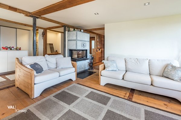 Der offene Wohn- und Essbereich mit Cheminée schafft eine warme Atmosphäre und lädt zum Verweilen ein. Grosse Fenster sorgen für viel Tageslicht und ermöglichen einen herrlichen Blick auf die umliegende Berglandschaft. Die südliche Ausrichtung verspricht Sonne von morgens bis abends, während die moderne Wandheizung mit Fernwärme für ein angenehmes Wohnklima sorgt.