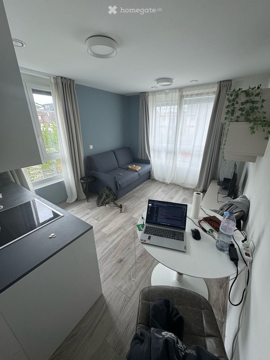 ? Wohnbereich mit Schlafsofa, Tisch und grossen Fenstern