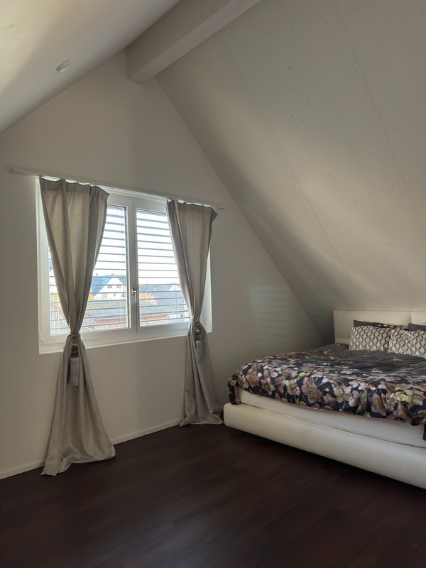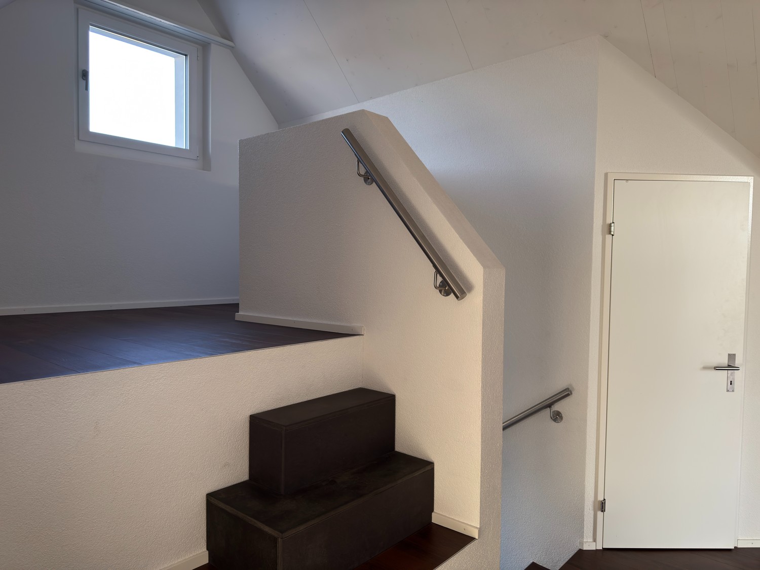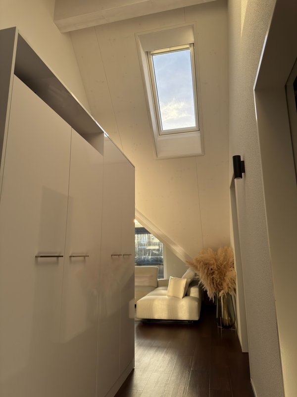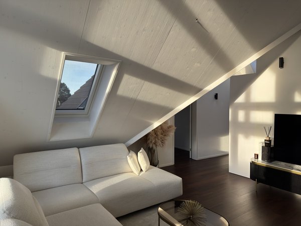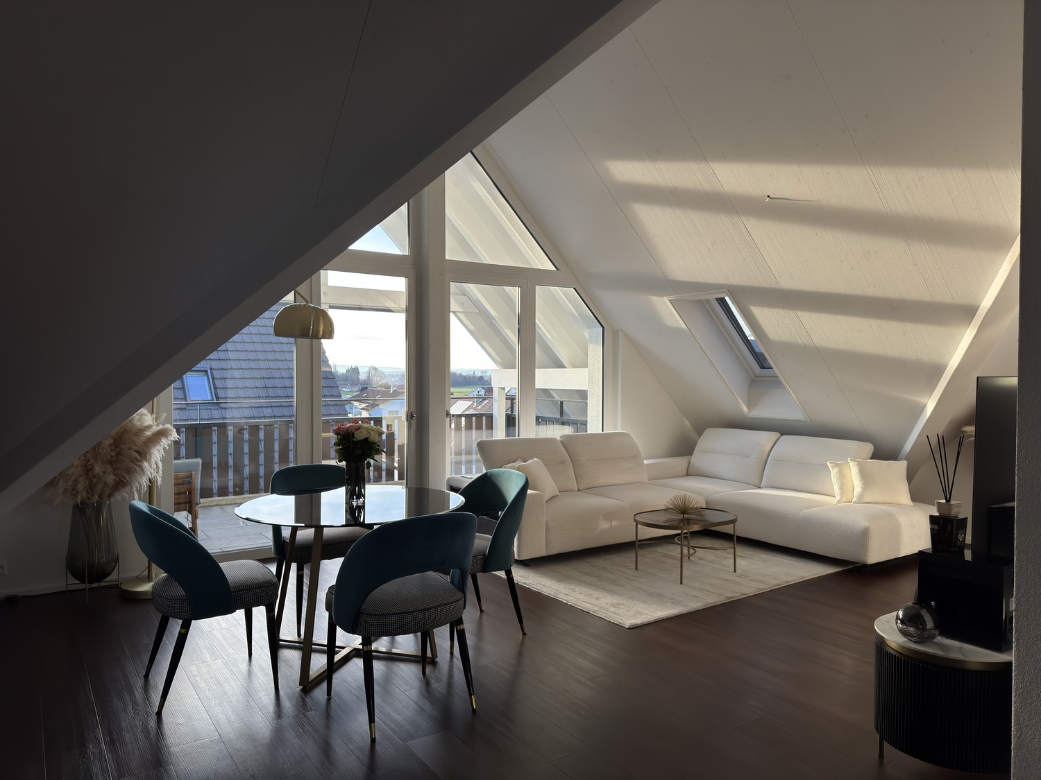 Diese grosszügige Dachwohnung in Tagelswangen bietet ein exklusives Wohnerlebnis, das bereits beim Betreten beginnt. Der Lift fährt per Haustürschlüssel direkt in Ihre Wohnung. Die maximale Deckenhöhe von 3.8m verbindet die Gemütlichkeit der Dachschrägen mit dem luftigen Raumgefühl eines Lofts. Für eine sensationelle Helligkeit sorgen die vollständig verglaste Wand im Wohnbereich und zahlreiche Dachschrägenfenster. Alle Fenster sind elektrisch bedienbar, inklusive motorisierter Öffnungsfunktion und Sonnenschutz für die Dachfenster sowie elektrischer Storen an den geraden Fenstern. Das Hauptschlafzimmer verfügt über ein direkt angebundenes Bad und wird durch ein separates Gäste-DU/WC ergänzt. Praktische Details wie der eigene Waschturm (WM/TU), diskret im Reduit verborgen, und ein grosses Entrée mit funktionaler Podest-Nische (ideal für Home-Office oder Leseecke) runden das Raumangebot ab.