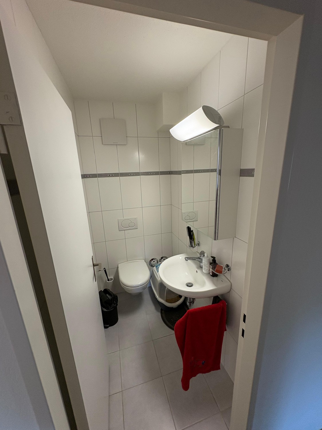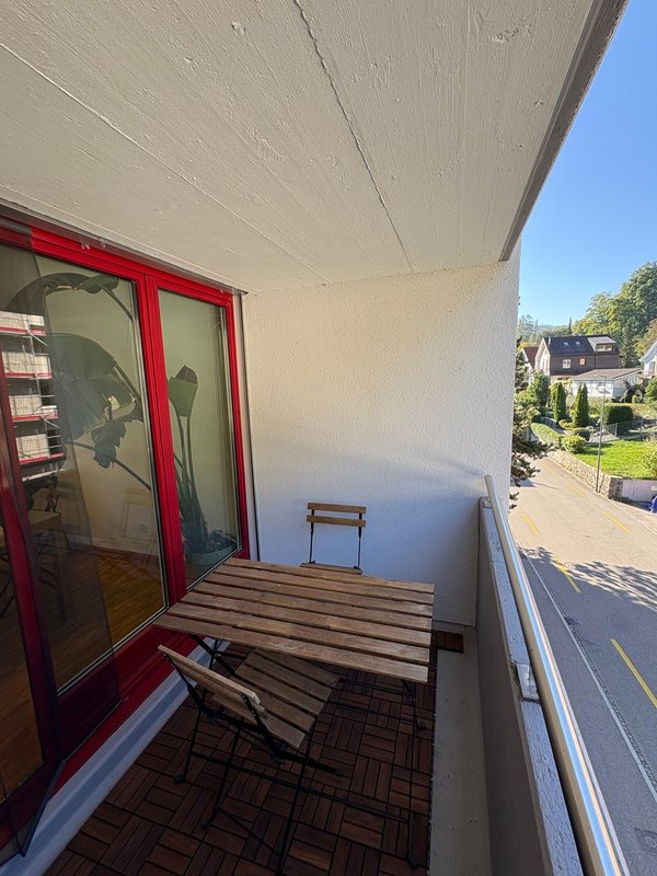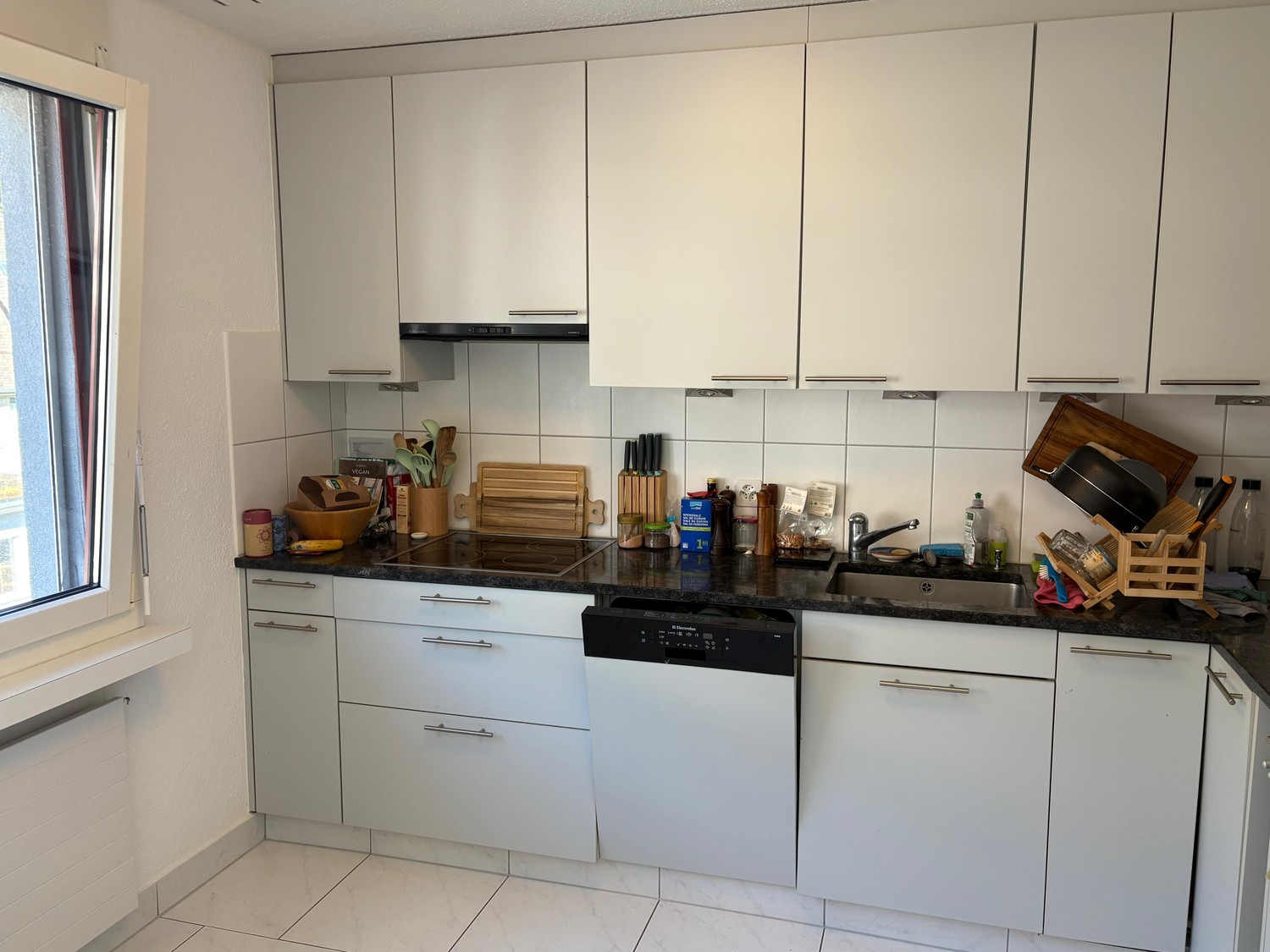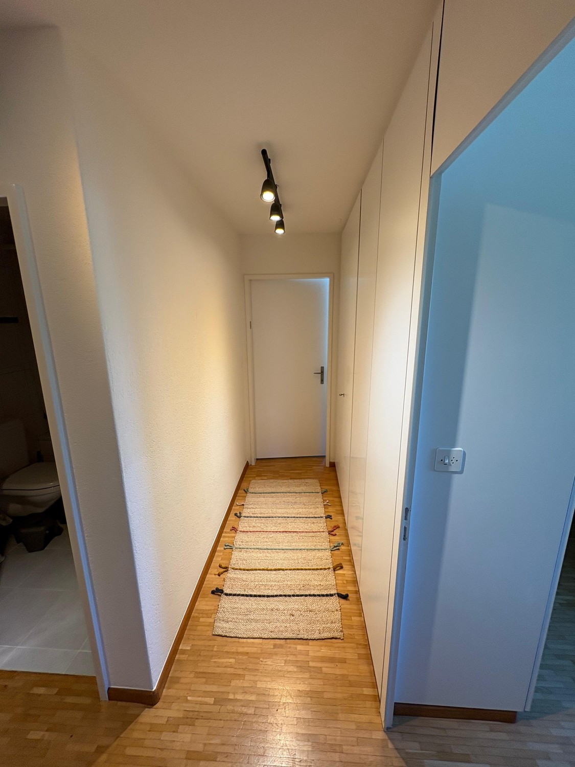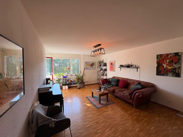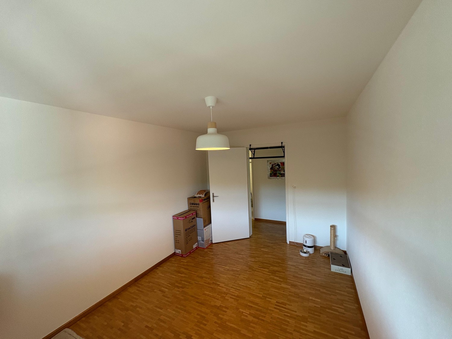 The available room is unfurnished and the rent is CHF 720/month. The apartment has 2 bathrooms, a large living room, a fully equipped kitchen, and 2 balconies. It's about a 15 minute walk to Baden train station, or you can take the bus right outside the house. The apartment block is directly across from a forest with walking trails, is a short walk to the Limmat river, and is close to restaurants and stores.