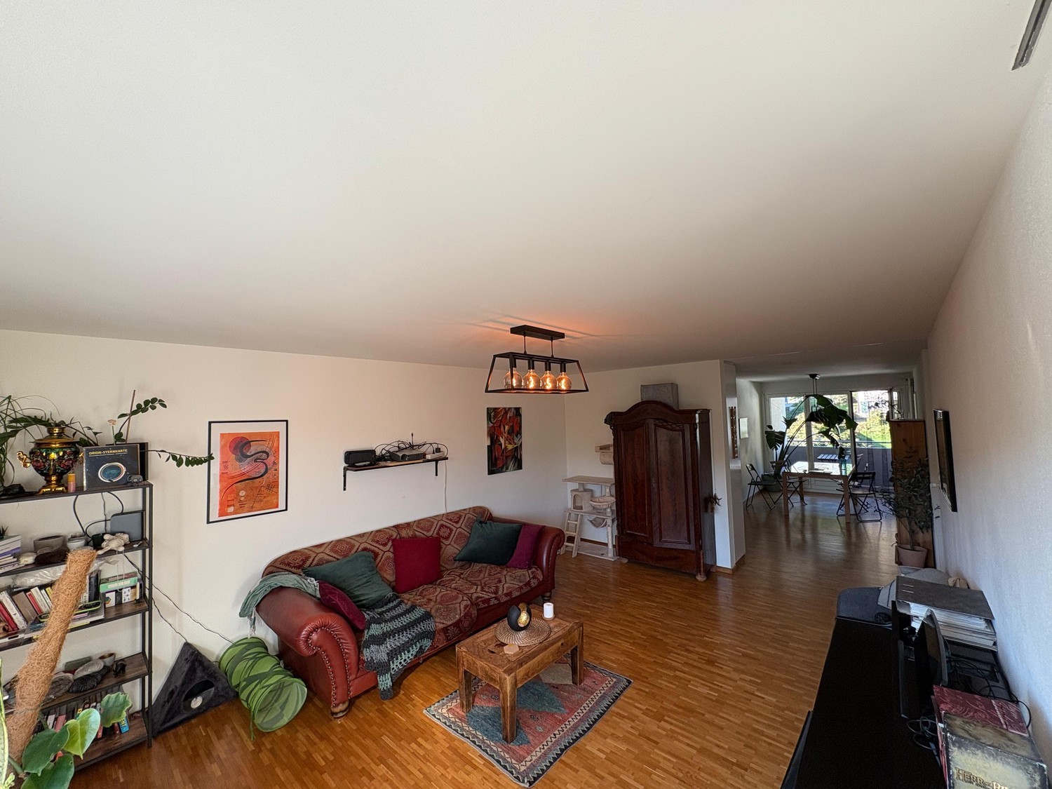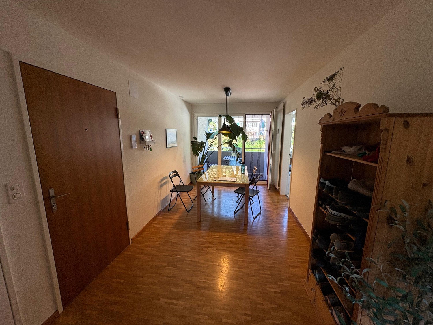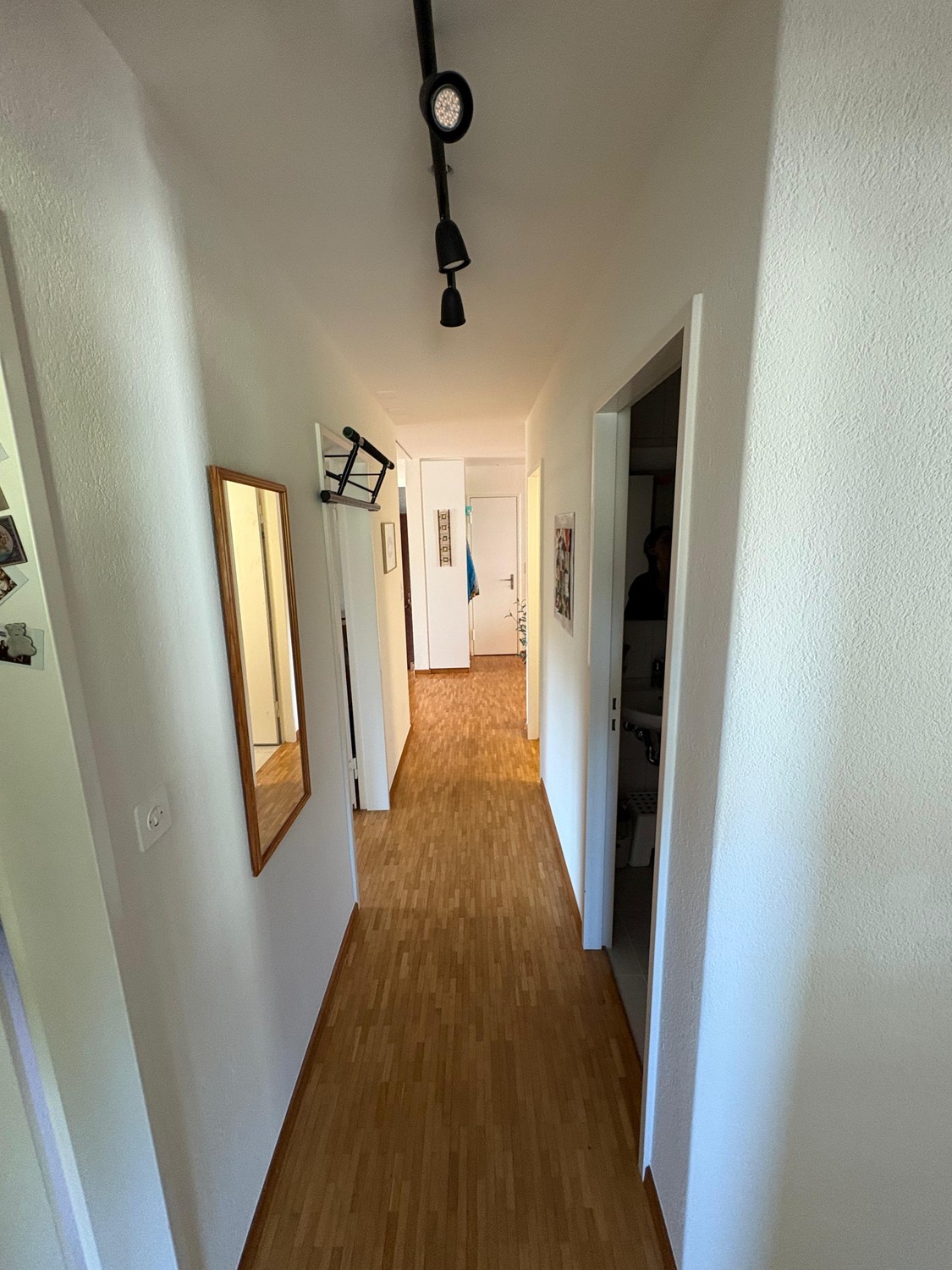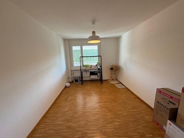 The available room is unfurnished and the rent is CHF 720/month. The apartment has 2 bathrooms, a large living room, a fully equipped kitchen, and 2 balconies. It's about a 15 minute walk to Baden train station, or you can take the bus right outside the house. The apartment block is directly across from a forest with walking trails, is a short walk to the Limmat river, and is close to restaurants and stores.