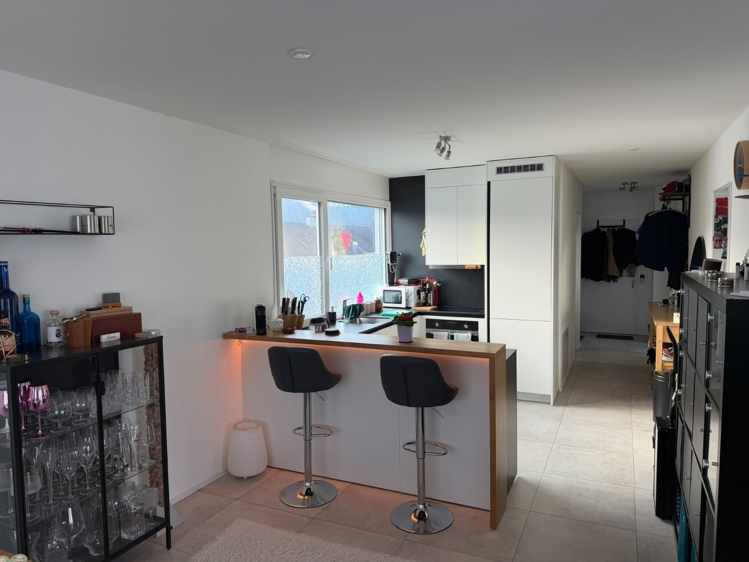 Die Wohnung besticht durch ihre moderne Ästhetik, und die offene Raumgestaltung vermittelt ein Gefühl von Weite und Eleganz. Die grosse Terrasse erstreckt sich direkt vom Wohnbereich aus und schafft eine nahtlose Verbindung zwischen Innen- und Aussenbereich – ideal für gesellige Abende oder entspannte Momente unter freiem Himmel.