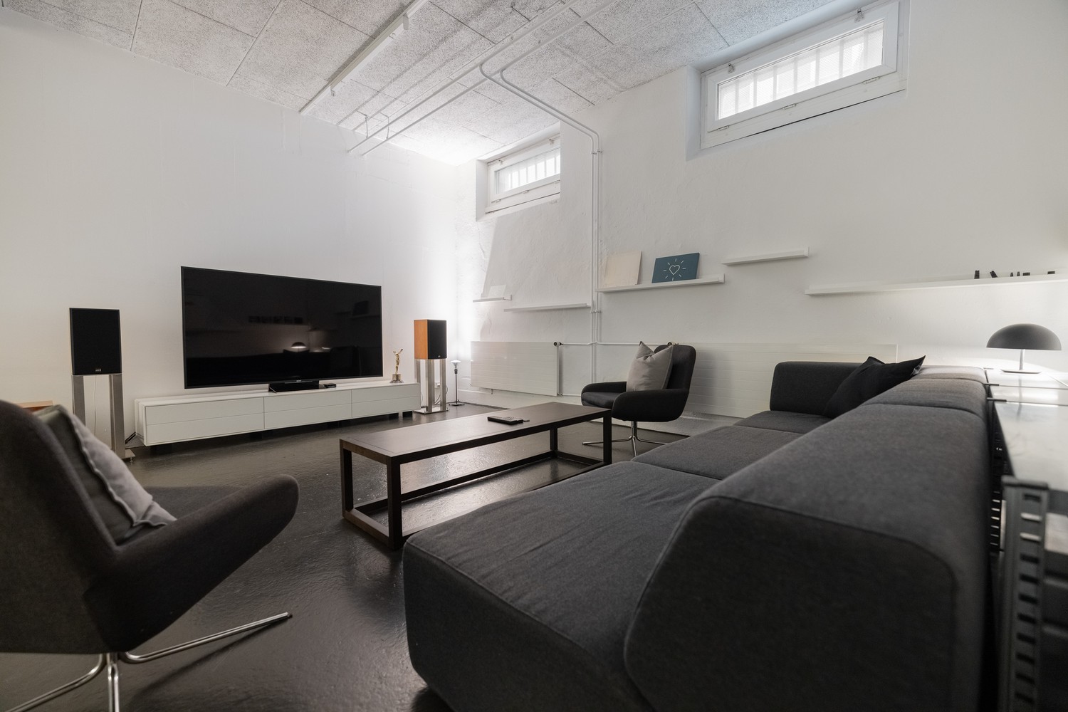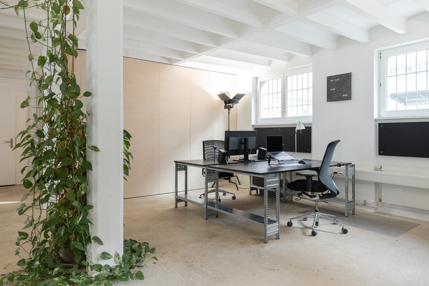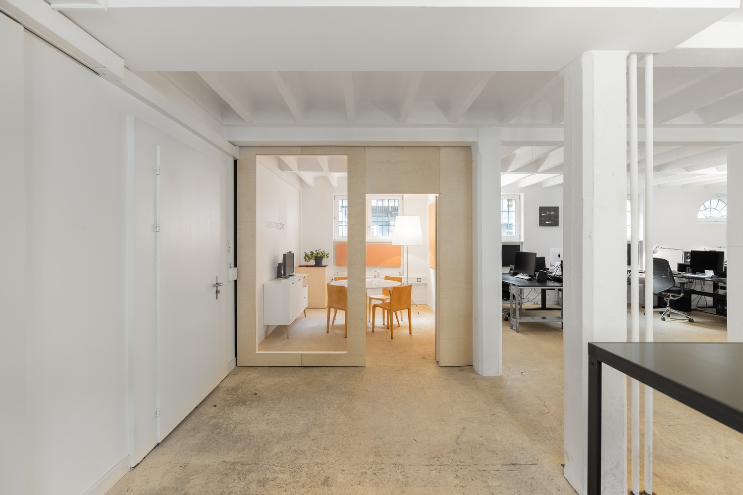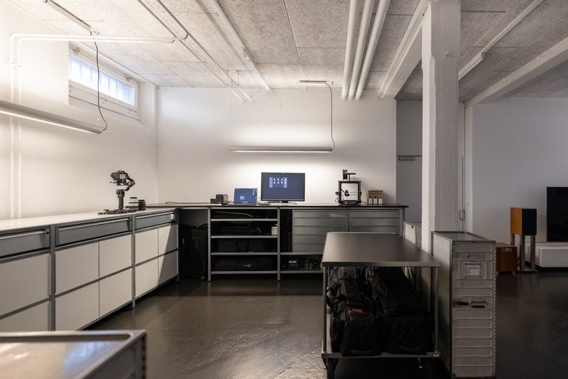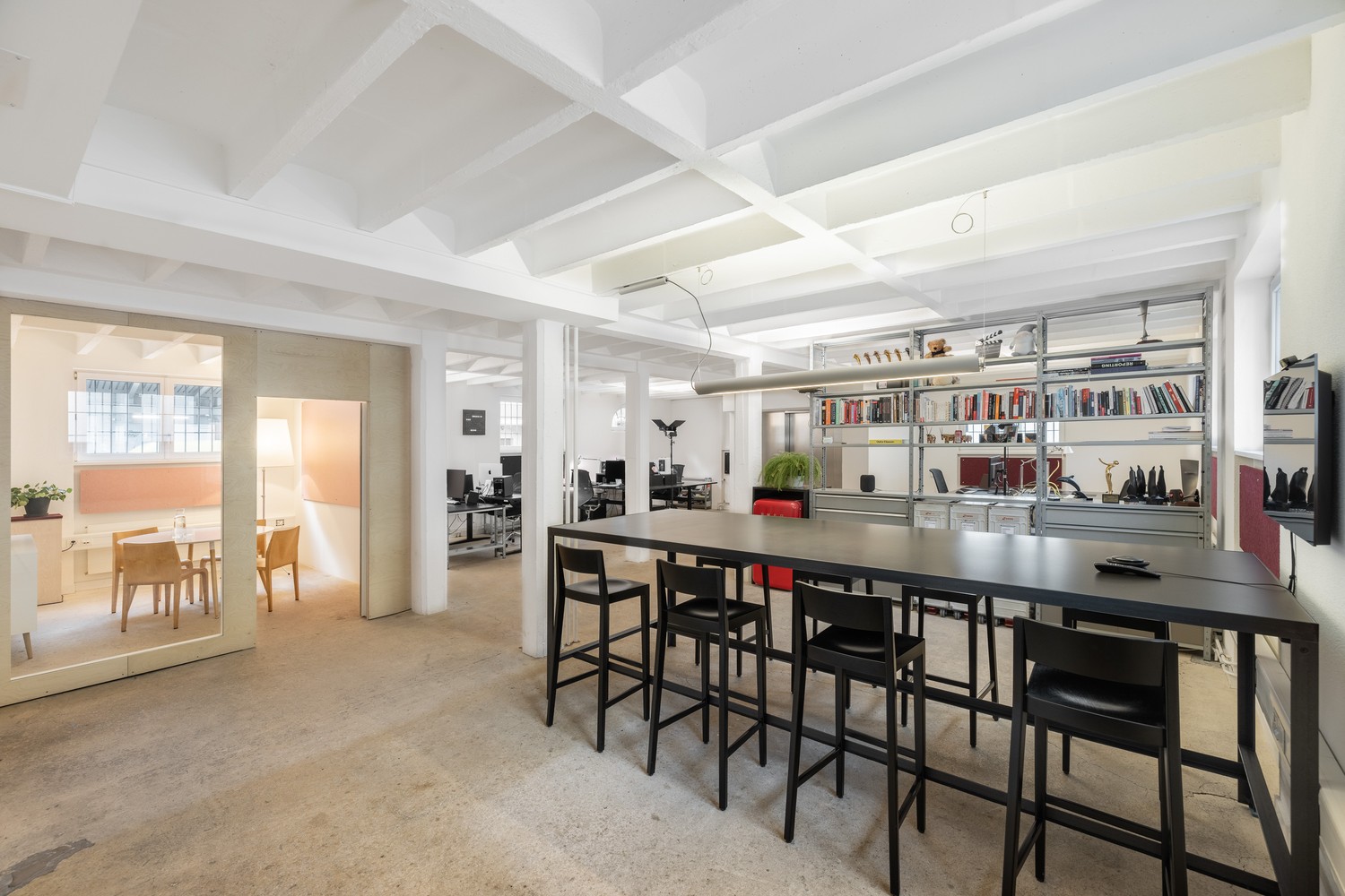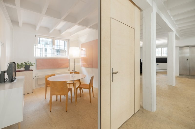 Es gibt einen grossen Tisch für Meetings, Workshops und Mittagessen, eine kleine Küche mit unserer Dalla Corte, ein separates Sitzungszimmer sowie einen voll ausgestatteten Raum im Untergeschoss für Präsentationen oder Besprechungen. Zudem gibt es ein Bad mit Dusche.