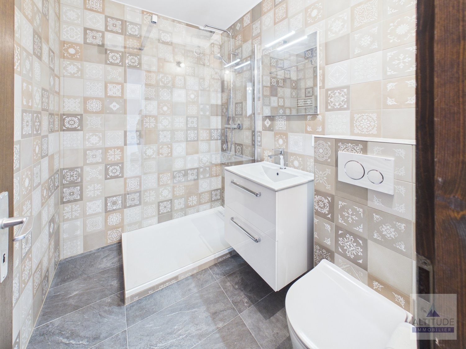 Salle de bain contemporaine avec douche à l’italienne, lavabo, WC et chauffe serviette