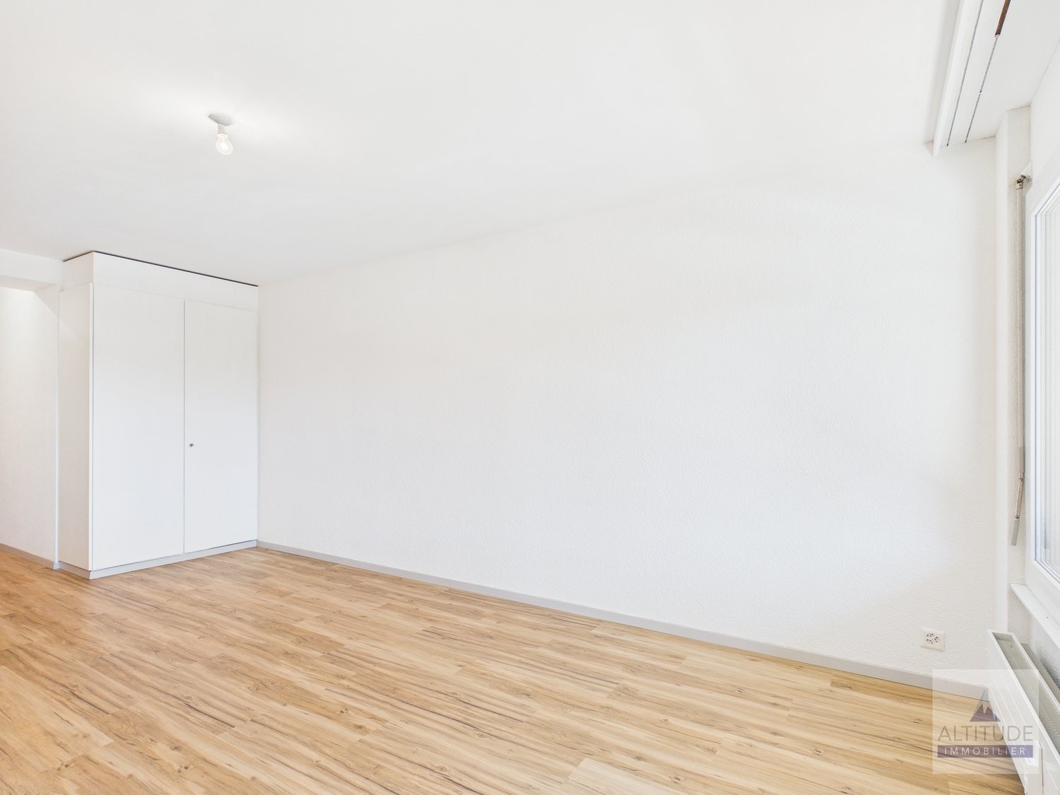 Séjour lumineux grâce à de grandes fenêtres, accès au balcon plein sud et rangement grâce à des armoires murales